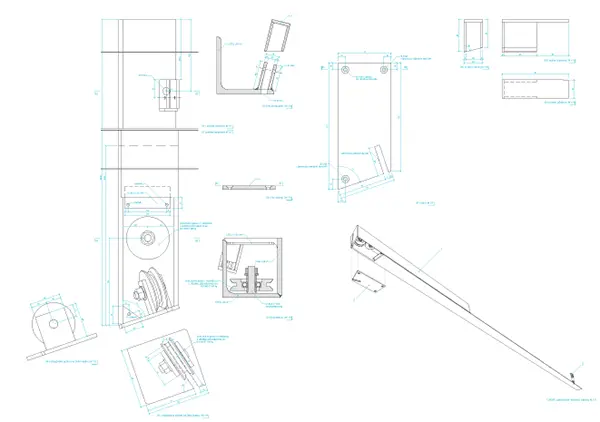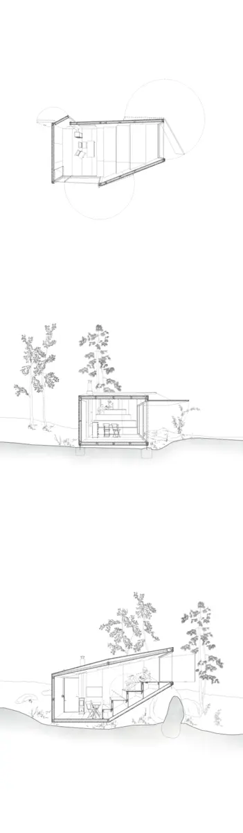 Aunque el diseño es chocante, los materiales utilizados son modestos: la madera de la estructura se obtuvo de los arboles de la propiedad; los paneles exteriores se adquirieron en establecimientos locales -ensamblados mediante simples uniones machihembradas- y la cubierta es de asfalto. Los grandes huecos de ventanas a ambos extremos de la cabina, disfrutan de vistas sobre el bosque completamente dispares, y se cierran mediante contraventanas colgantes para protegerlos de los elementos. La contraventana más grande, que se encuentra a nivel del suelo, se acciona a mano con una polea fabricada por un herrero local. La ventana situada en el extremo más elevado, ofrece una vista de pájaro sobre las copas de los arboles a modo de torre de vigilancia privada.