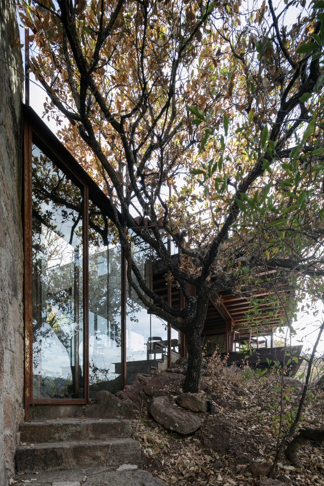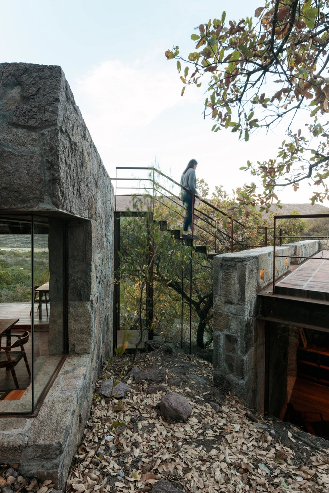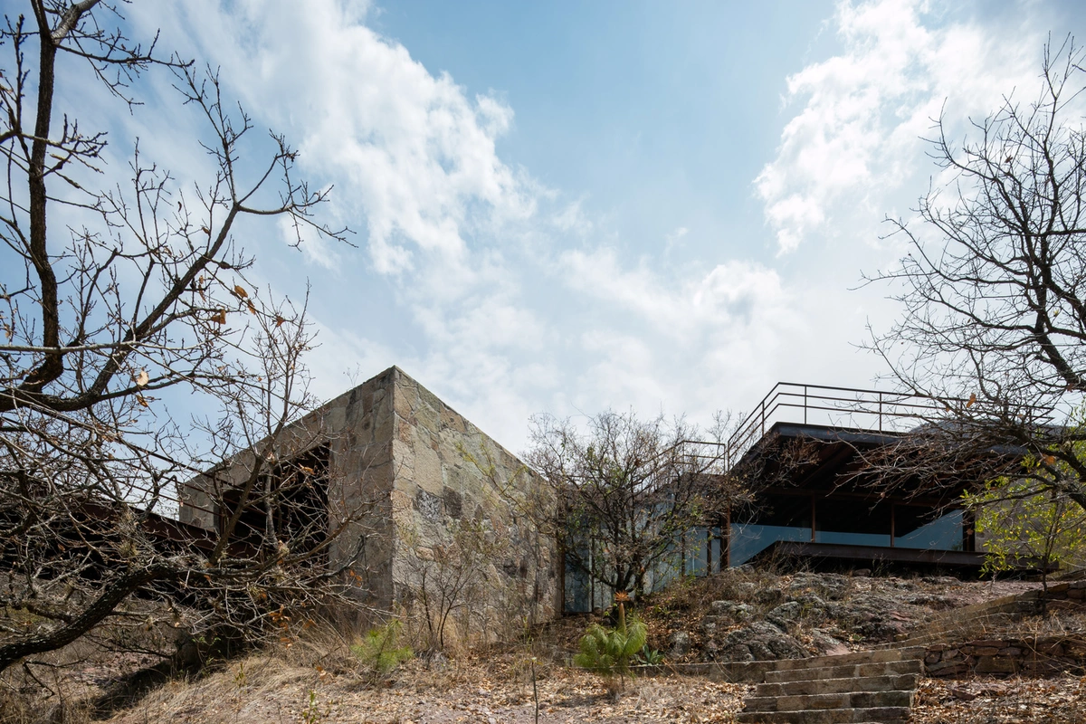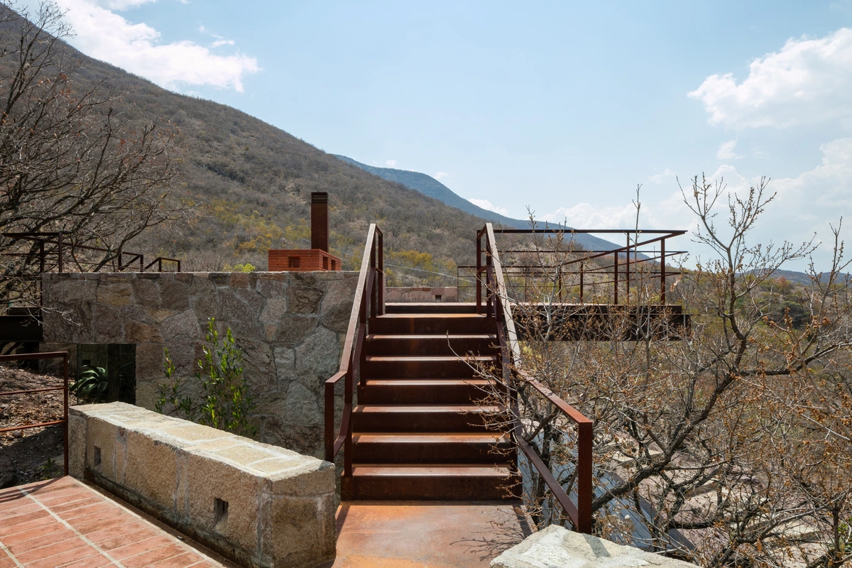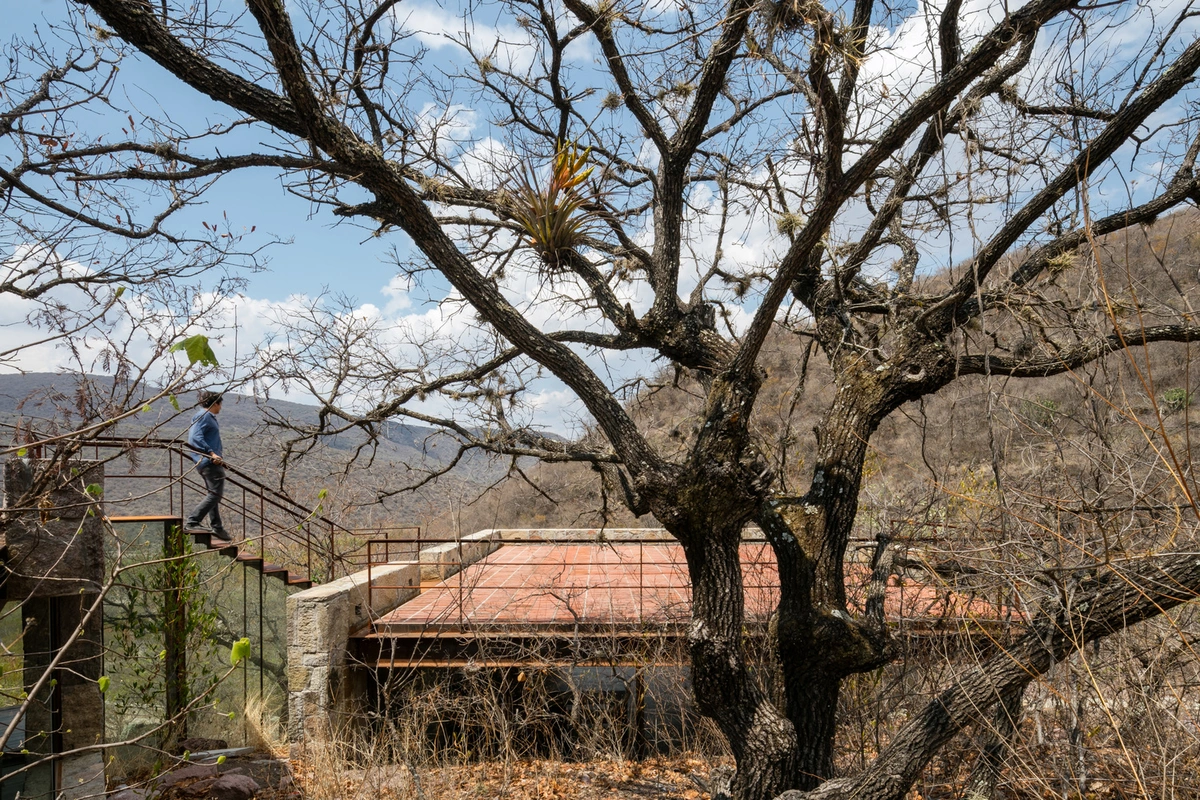 Construida en las áridas colinas de San Antonio Teitipac, dentro del estado mexicano de Oaxaca, el proyecto respeta el arbolado existente de copales y encinas. En lugar de plantear una casa compacta, el programa se dispone en dos volúmenes separados que siguen el pronunciado desnivel, uno semienterrado hacia el sur y el otro elevado hacia el norte.