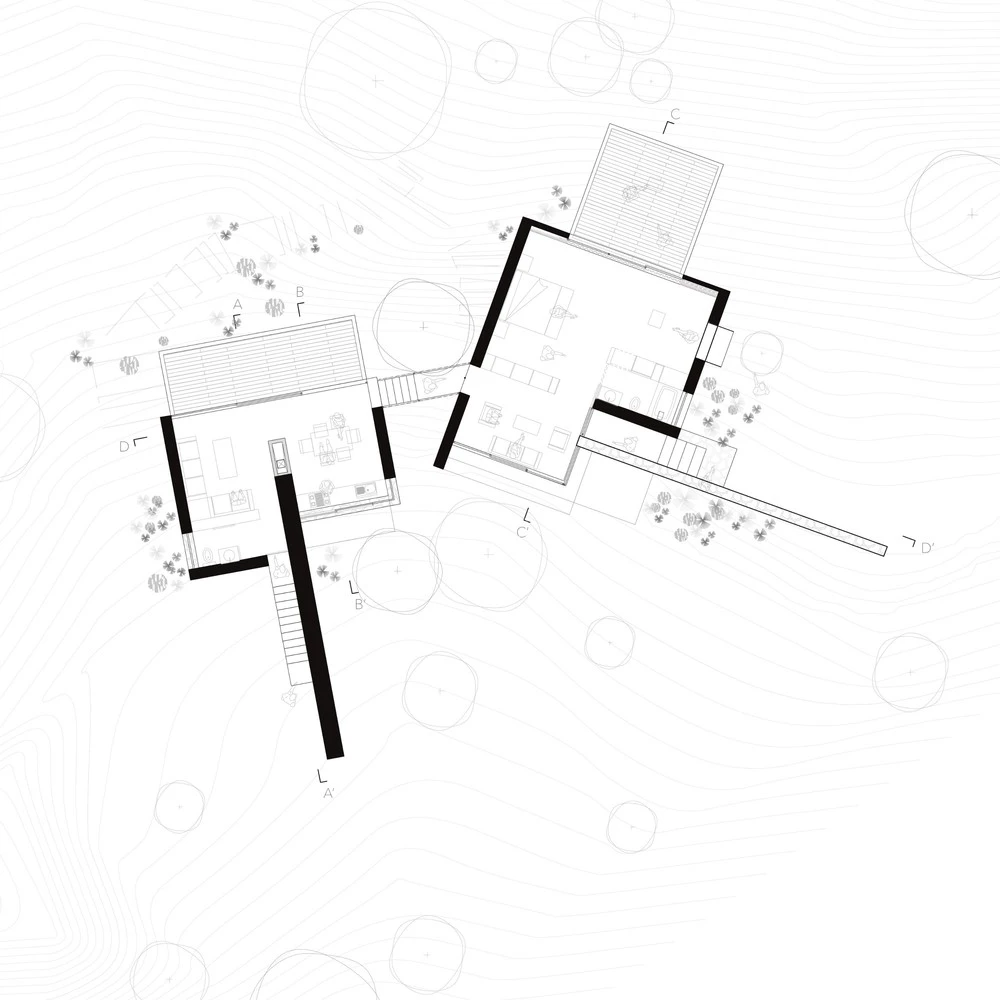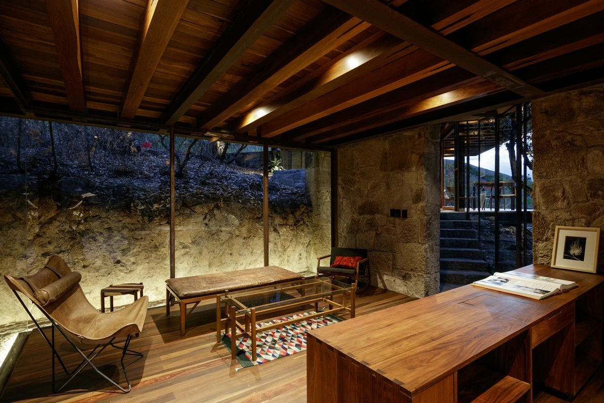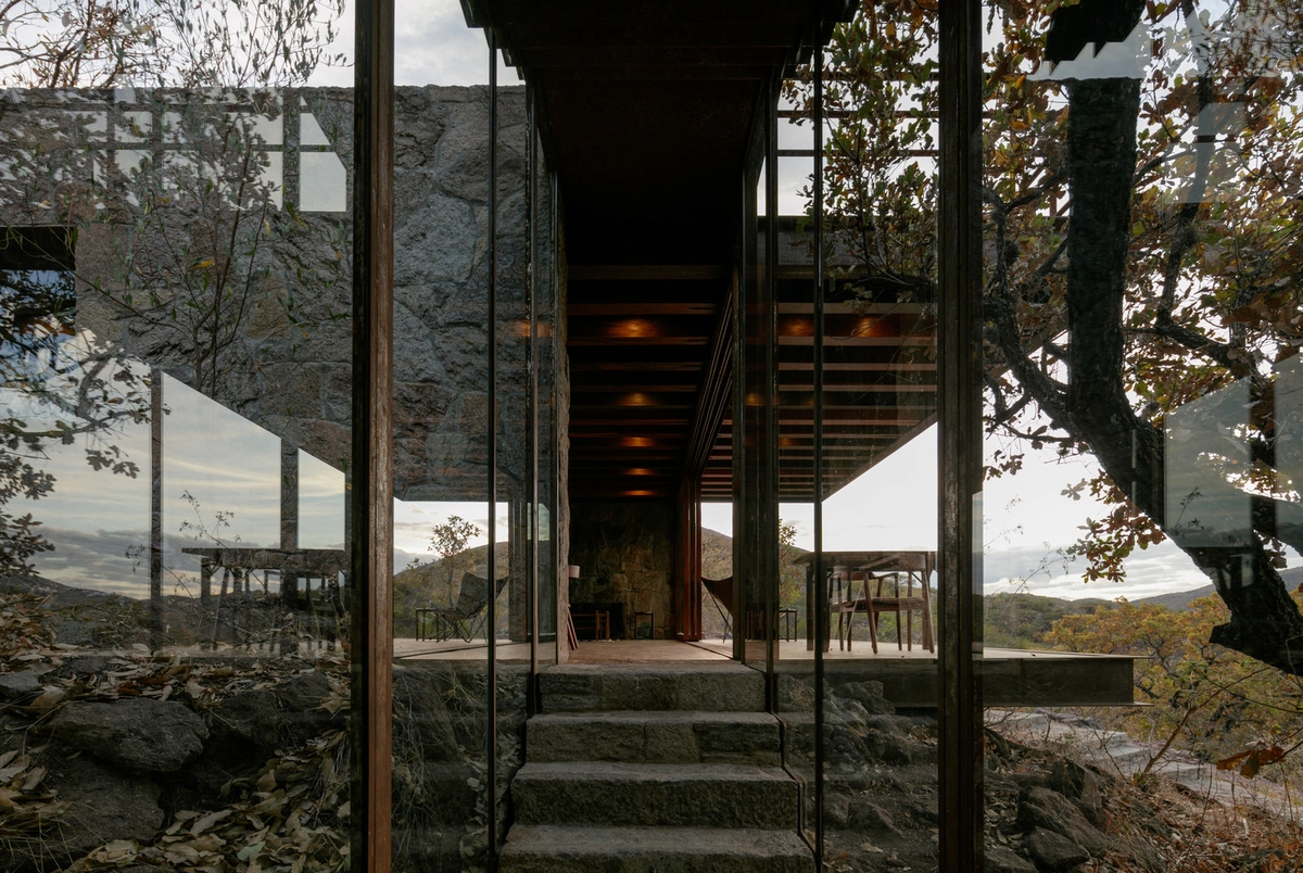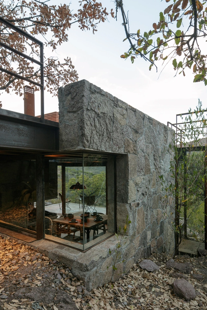Construida en las áridas colinas de San Antonio Teitipac, dentro del estado mexicano de Oaxaca, el proyecto respeta el arbolado existente de copales y encinas. En lugar de plantear una casa compacta, el programa se dispone en dos volúmenes separados que siguen el pronunciado desnivel, uno semienterrado hacia el sur y el otro elevado hacia el norte.