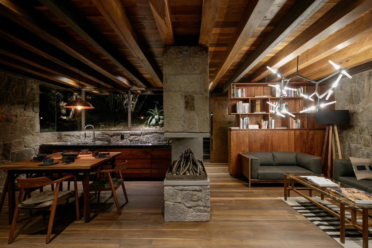 En cuanto al espacio público, queda organizado en el segundo volumen con la chimenea ocupando el lugar central y ejerciendo de separador de ambientes entre la cocina-comedor y la sala de estar. Aquí, los muros de piedra –elaborados con material de los propios montes– son el elemento predominante. Mientras que en el interior resaltan el aire rústico de la cabaña, en el exterior se funden cromáticamente con la ladera.