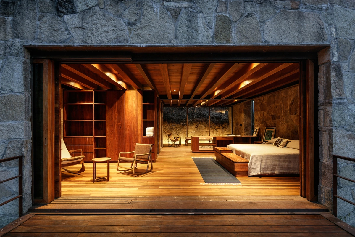 El área privada, con una distribución en suite y revestida casi por completo de madera, potencia la idea de refugio, de gruta inusualmente cálida y acogedora en la montaña. Un abrigo que, sin embargo, descubre en uno de sus extremos un gran mirador panorámico en voladizo desde donde contemplar la naturaleza.