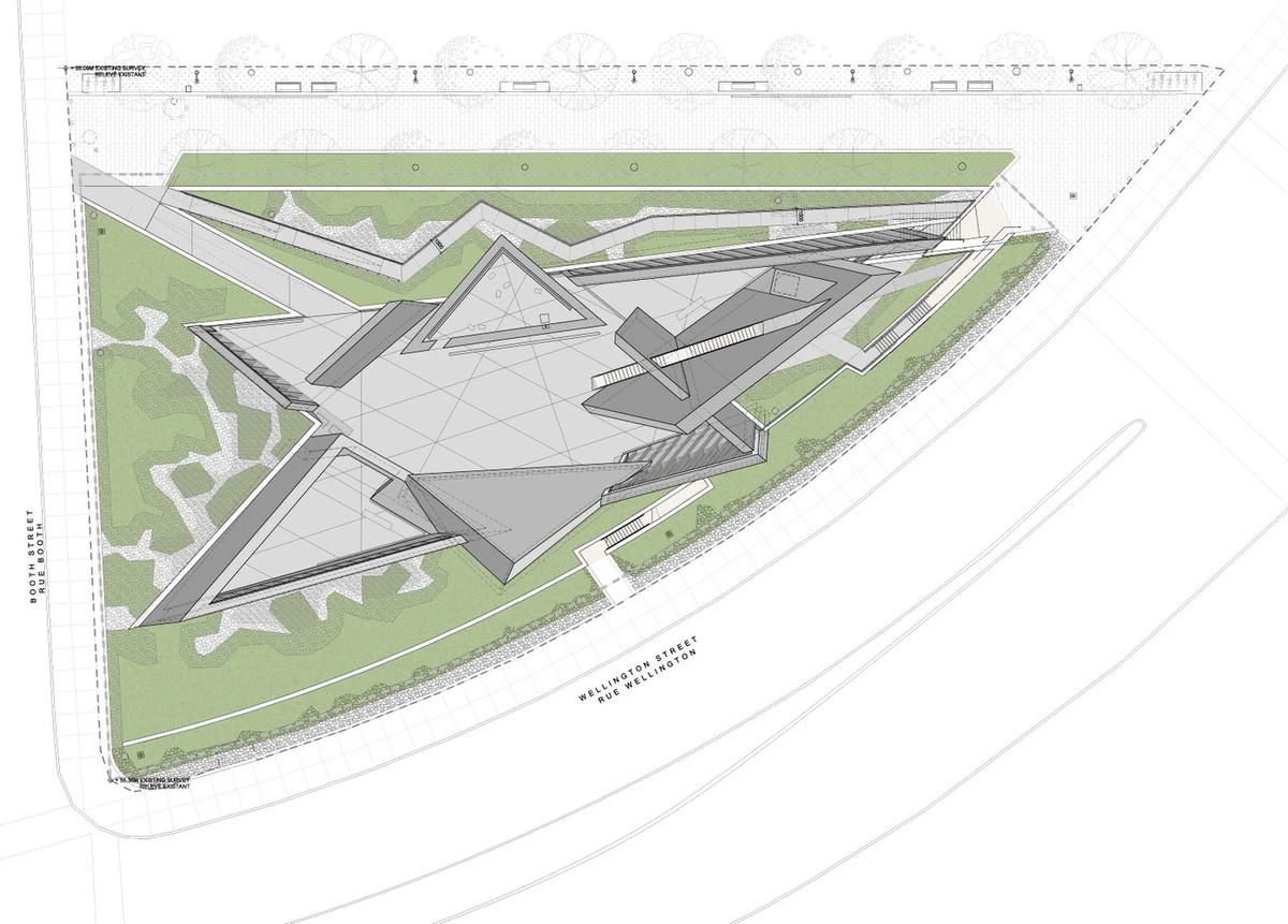 Este impresionante símbolo de 3.200 m2 –ideado por la firma estadounidense Studio Libeskind– está situado en la esquina de las calles Booth y Wellington, frente al Museo de la Guerra de Canadá, al que conecta con el centro histórico de la capital.