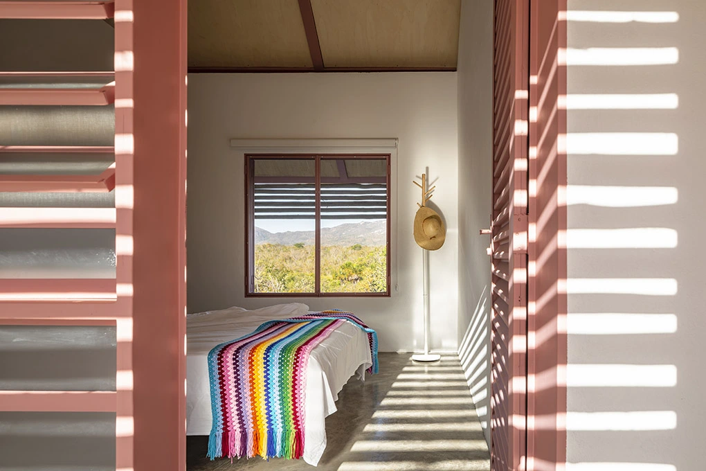 Los dormitorios, la sala de estar y la cocina cuentan con ventilación cruzada constante, y los troncos de eucalipto dispuestos en horizontal son una barrera para el sol, además de repeler a los insectos.