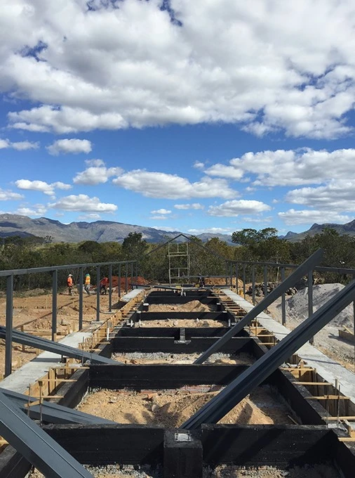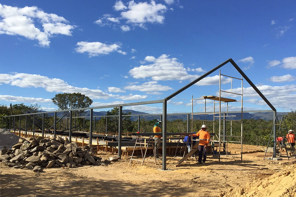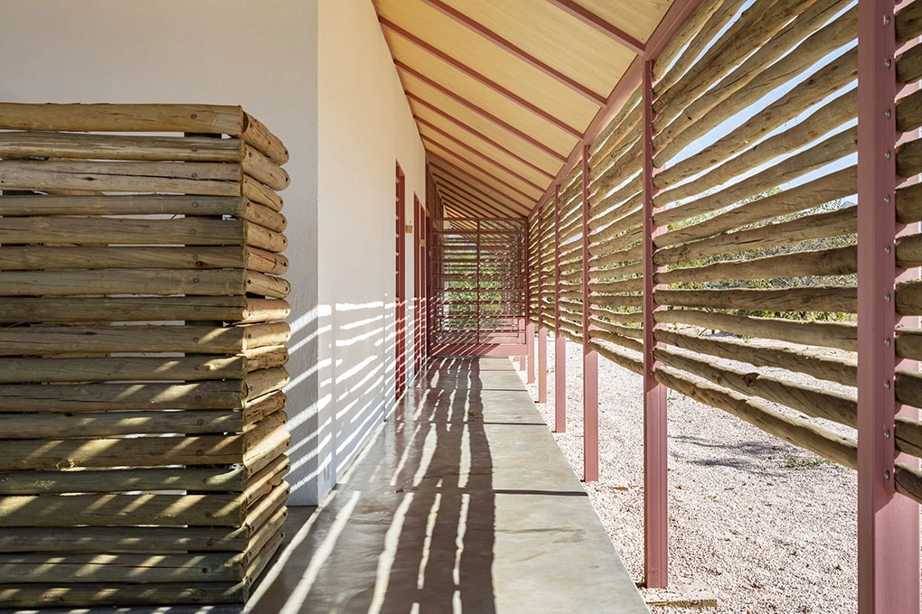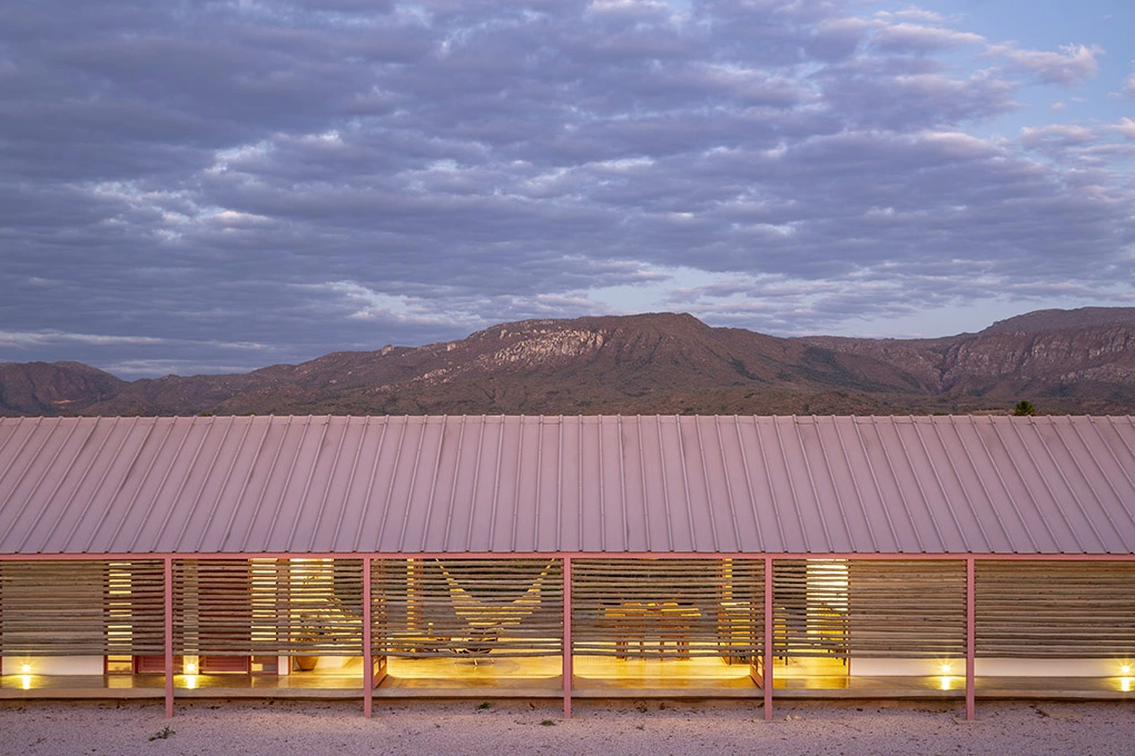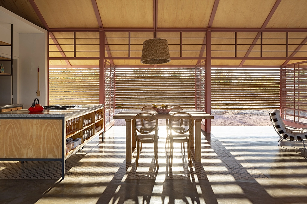 Así pues, se partió de elementos prefabricados que se ensamblaron in situ para luego pasar a las estructuras más pequeñas. Y sí, fue el tejado lo primero que se levantó: una secuencia modular de perfiles metálicos recubiertos con placas termoacústicas (de aluminio, poliuretano y madera). De este modo, se proporcionaba sombra a los trabajadores mientras se ocupaban de procesos más artesanales. Sus aleros extendidos generan un perímetro espacioso que protege la vivienda de la luz solar directa en las horas de más calor y sirve como área de circulación entre habitaciones.