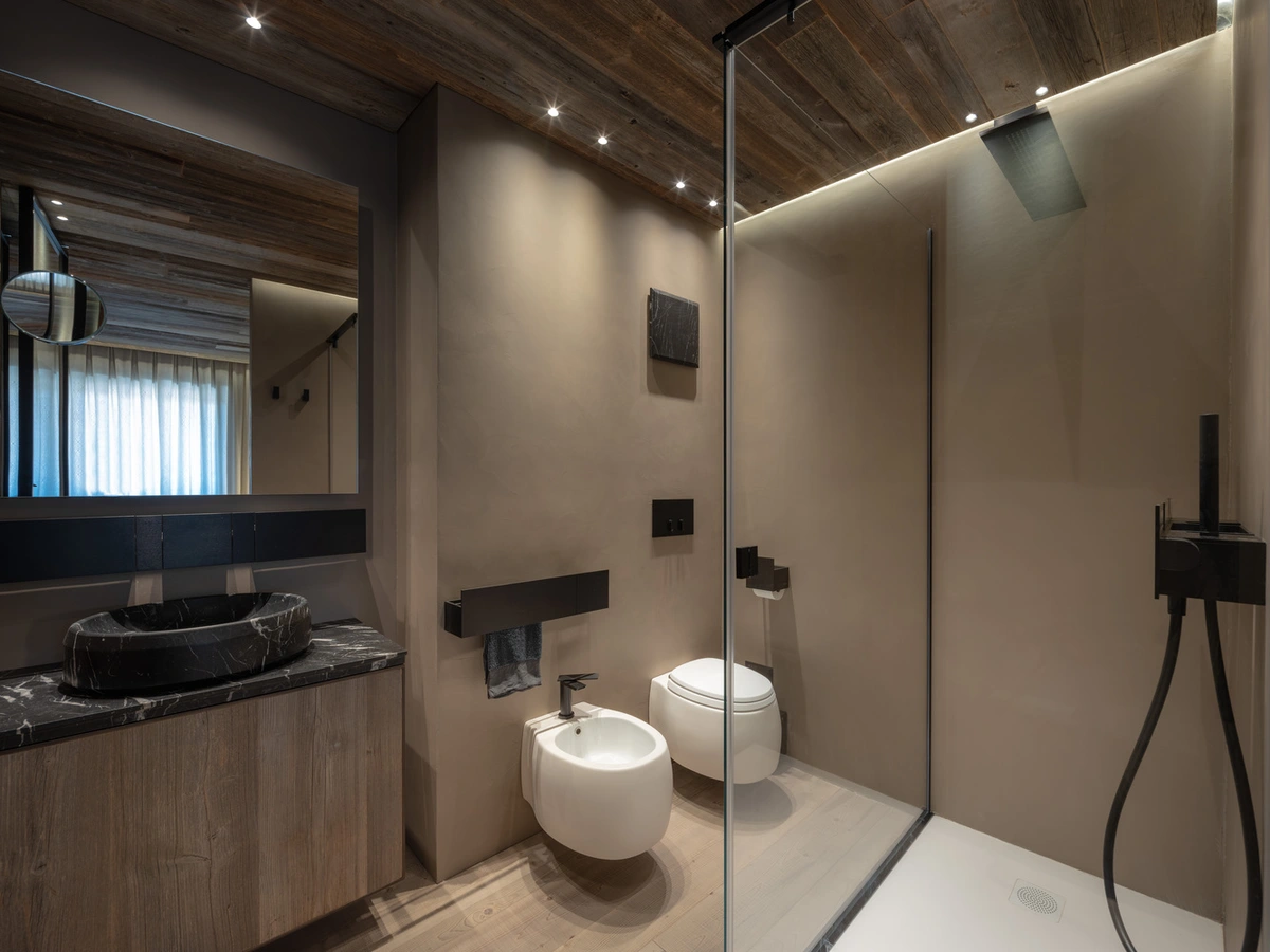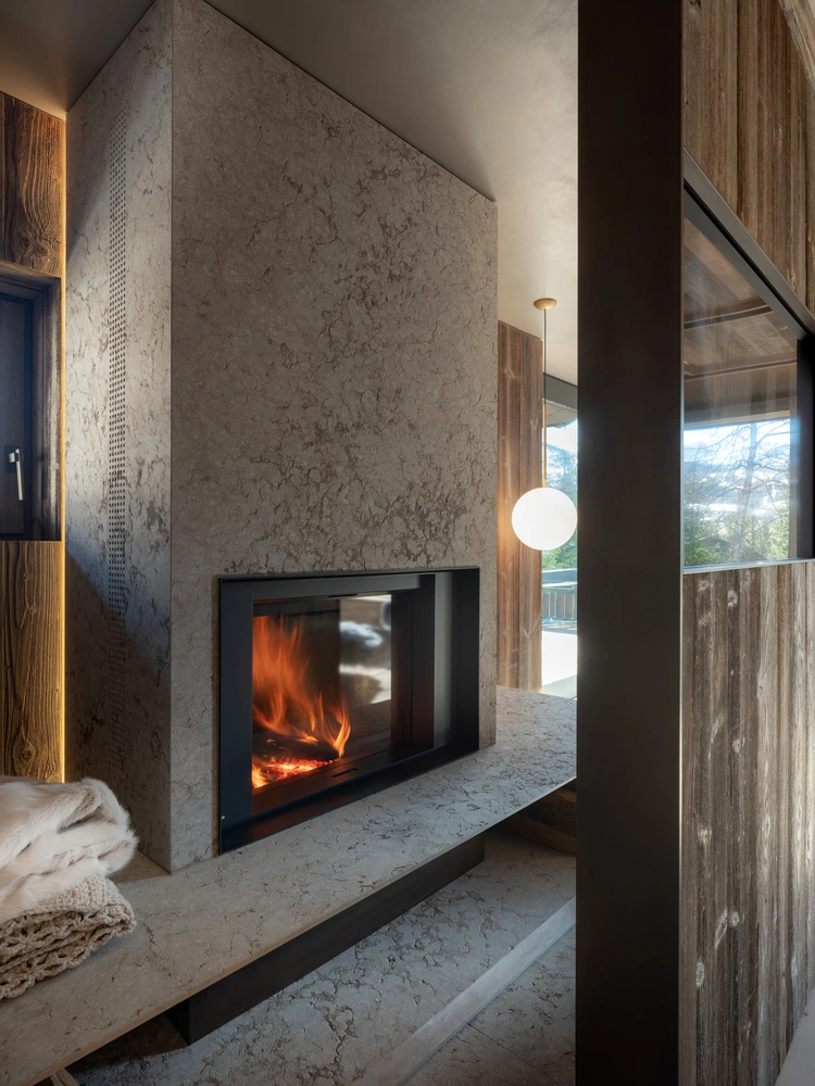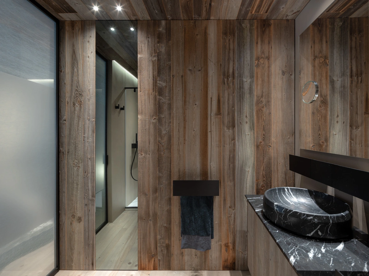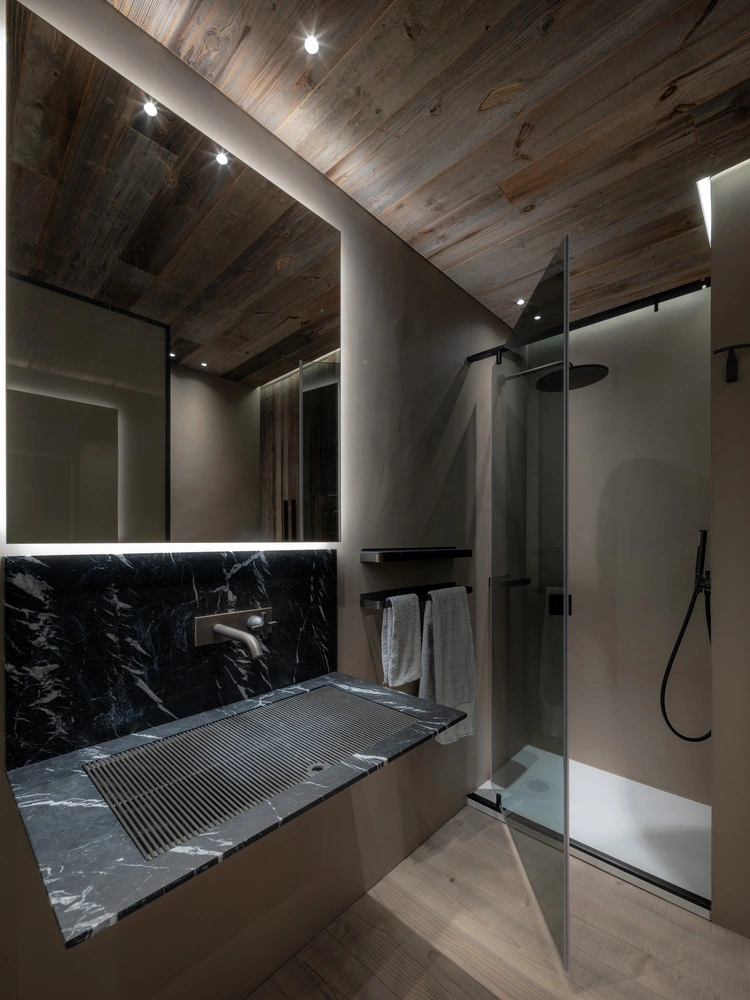 La pieza central de la Casa Cortina es la sala de estar, unida al comedor, con acceso directo a la terraza y unas vistas increíbles del bosque y las cumbres, potenciadas por medio de grandes ventanales. La piedra local, extraída de la cantera de Castellavazzo, viste las columnas y funciona como un elegante separador de espacios. En los baños, son los accesorios en mármol negro los que ponen el contrapunto natural.