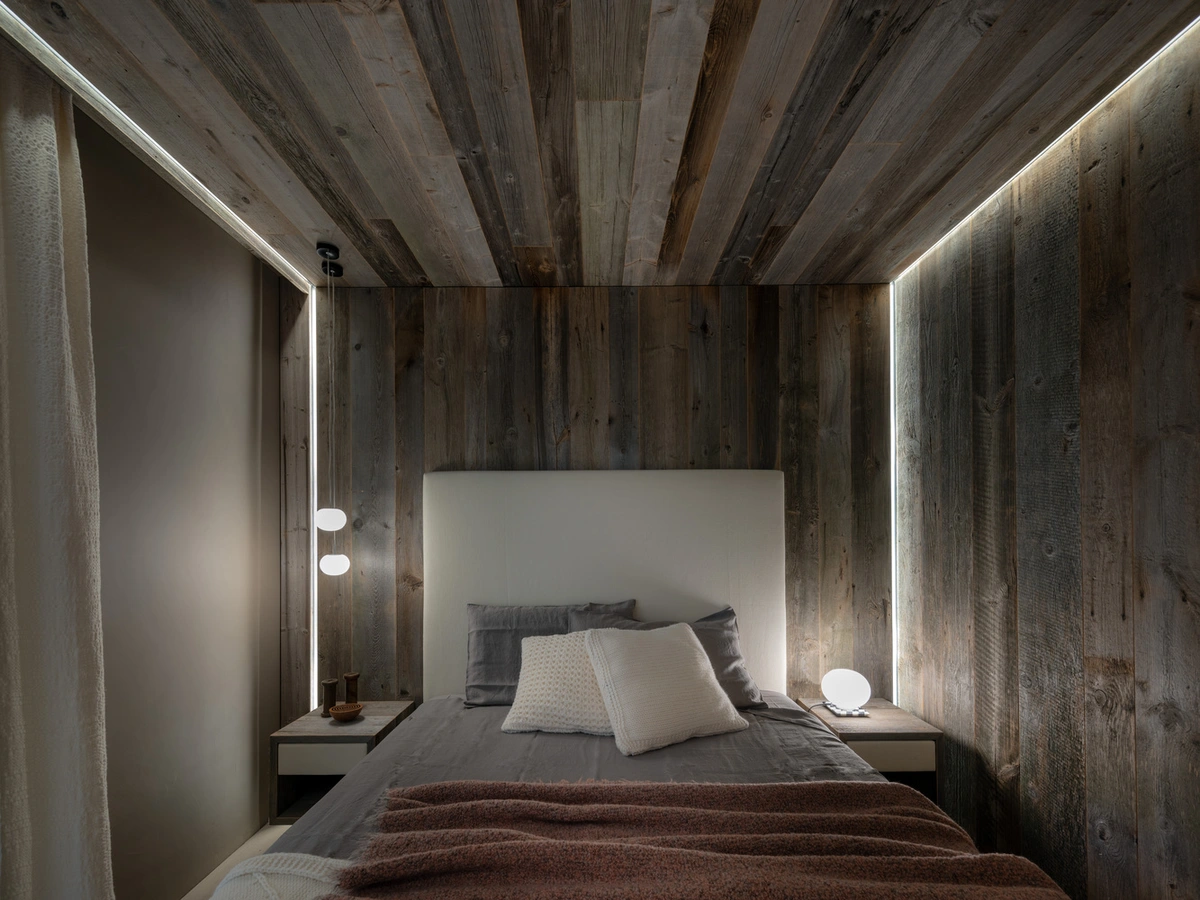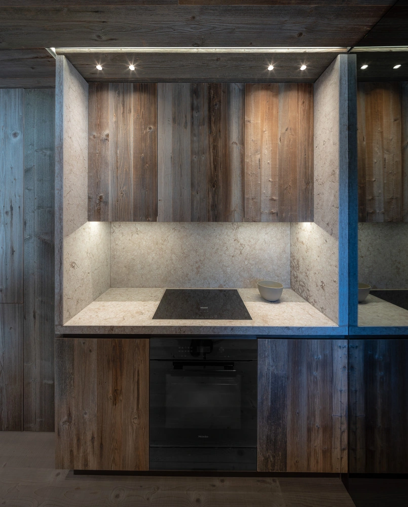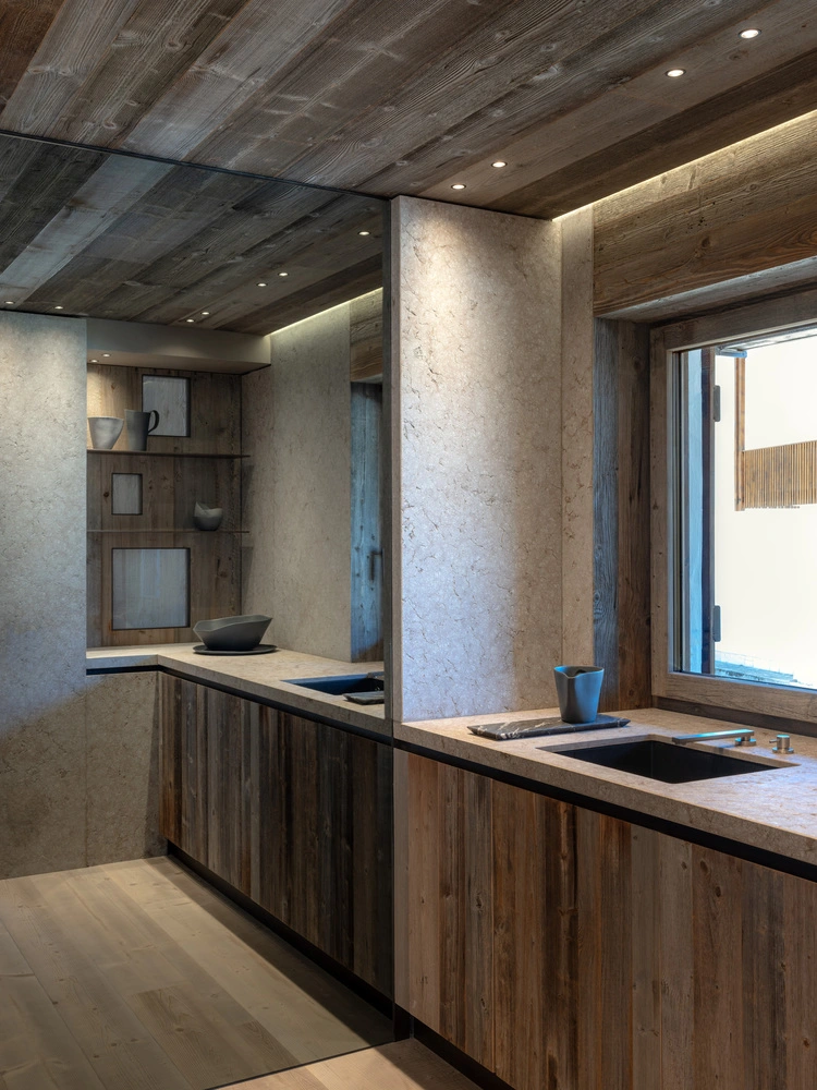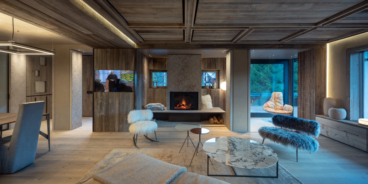 Para el cambio de look, se decidió apostar por materiales abundantes en esta zona patrimonio de la Unesco: piedra caliza dolomítica y madera rescatada de unos antiguos graneros con más de un siglo de historia. Con estos elementos, el equipo efectuó una relectura del estilo alpino tradicional, incorporando un aire totalmente contemporáneo a través de las disposiciones interiores, los acabados y una acertada elección de mobiliario.