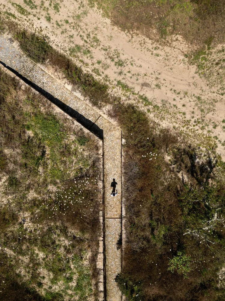 Pero es en los materiales donde la Casa da Levada subraya su compromiso con una vivienda sostenible. El revestimiento exterior se compone de paneles de corcho, un recurso local, natural y reciclable. La cubierta ajardinada prolonga la pendiente del terreno, reforzando su integración paisajística y aportando aislamiento. El patio se pavimentó reutilizando piedra de unas antiguas ruinas, aplicando una lógica de economía circular y memoria constructiva.