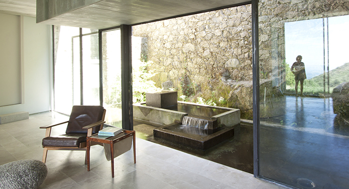 A continuación, otro de los rincones con encanto de la casa, presidido por un conjunto de butaca y mesa auxiliar danesas, en el que relajarse leyendo junto a una fuente interior que aporta frescura y serenidad a la casa.