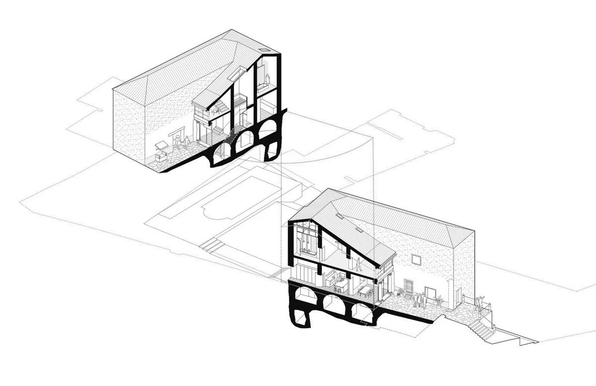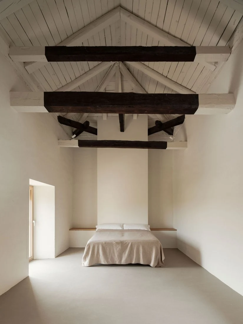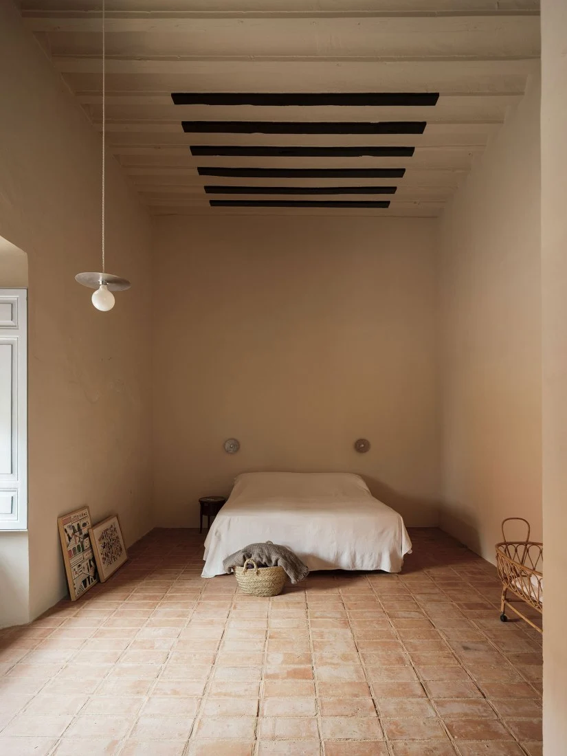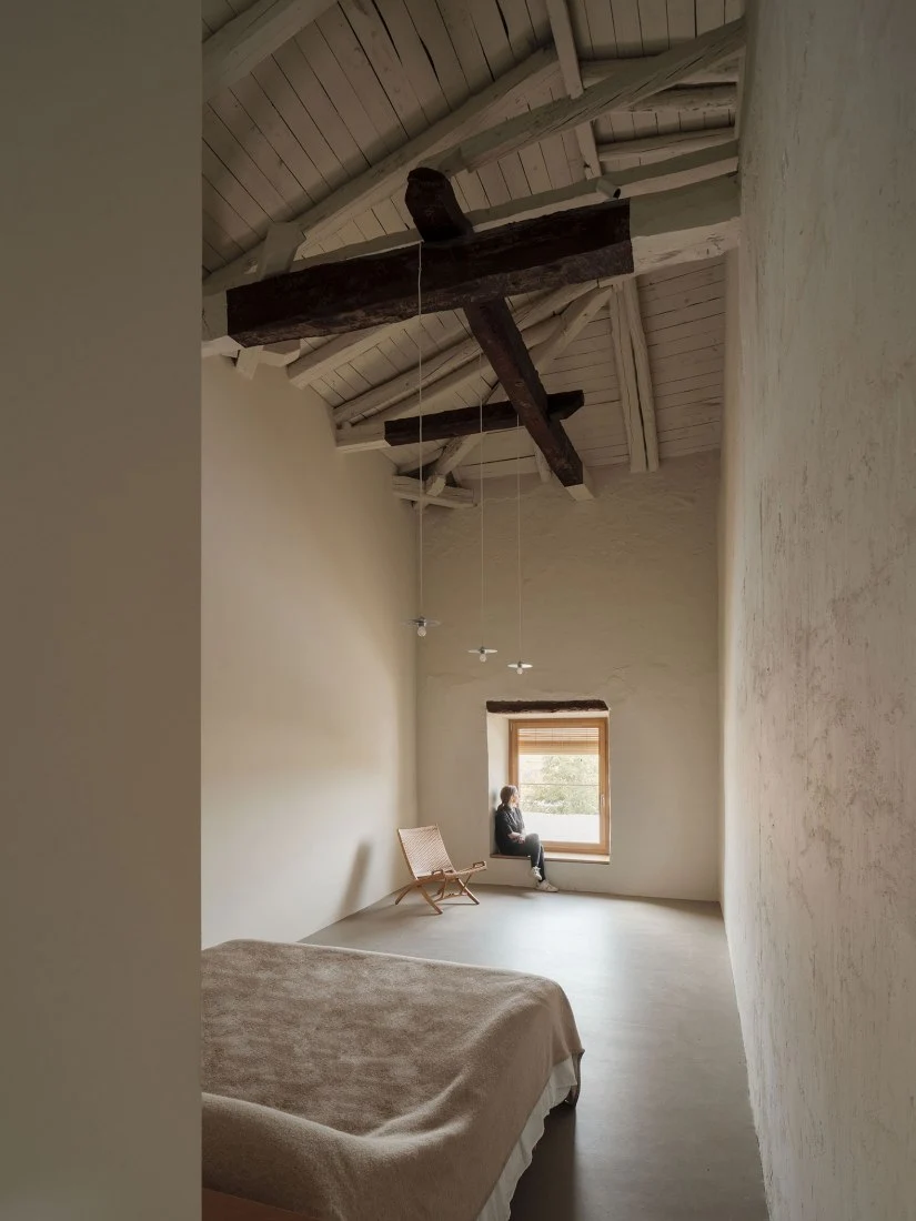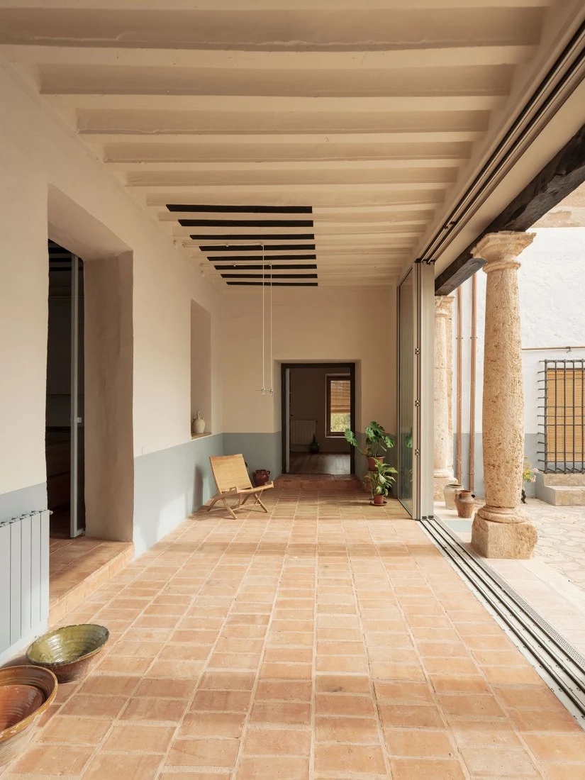 Las líneas limpias y los colores suaves contrastan con los elementos rústicos y originales que se han conservado, como los azulejos decorativos y los marcos de madera que cuentan el paso del tiempo. Además, la intervención da especial importancia a los materiales locales, reduciendo la huella ecológica y apoyando los oficios de la zona en elementos como las carpinterías, las baldosas o la piedra.