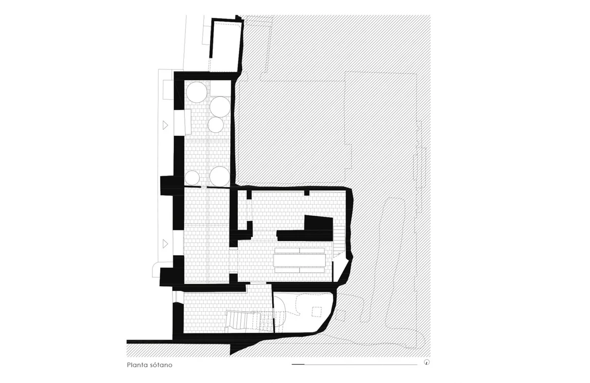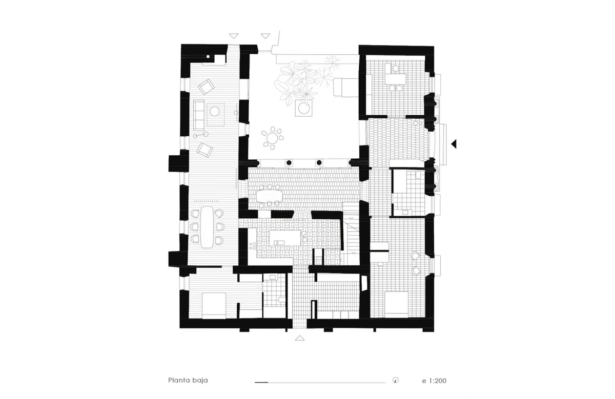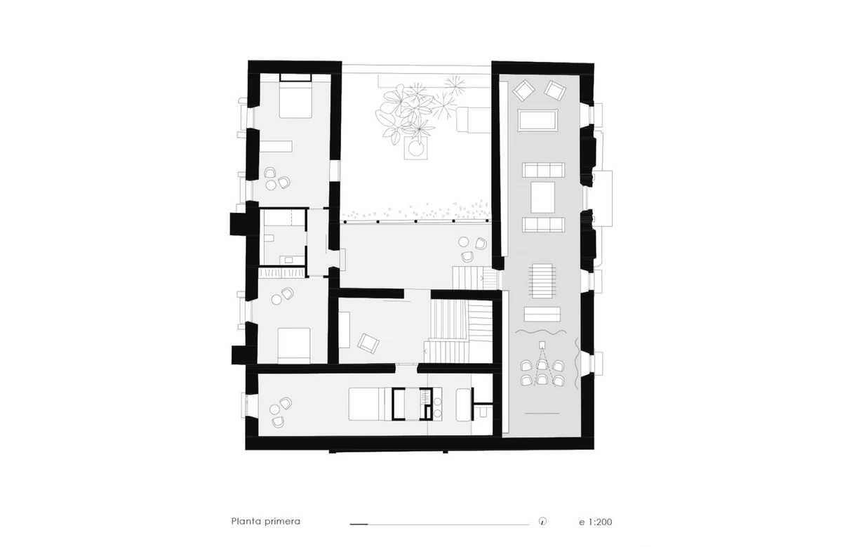 El espacio se organiza en tres pisos con diferentes programas. El sótano aloja espacio para almacenaje y ocio, mientras que en la planta principal se encuentra la cocina como punto central, con acceso desde el patio, una forma de generar continuidad en la vivienda. En la misma planta encontramos una sala de estar y dos dormitorios. La segunda planta se destina al descanso y el ocio, con tres habitaciones y una segunda sala de estar.