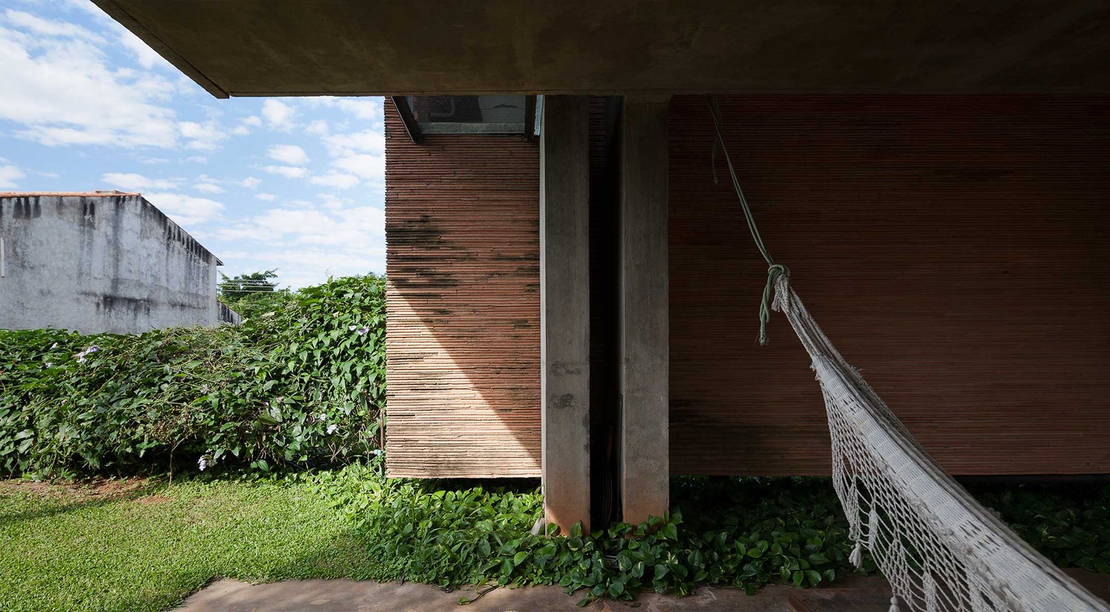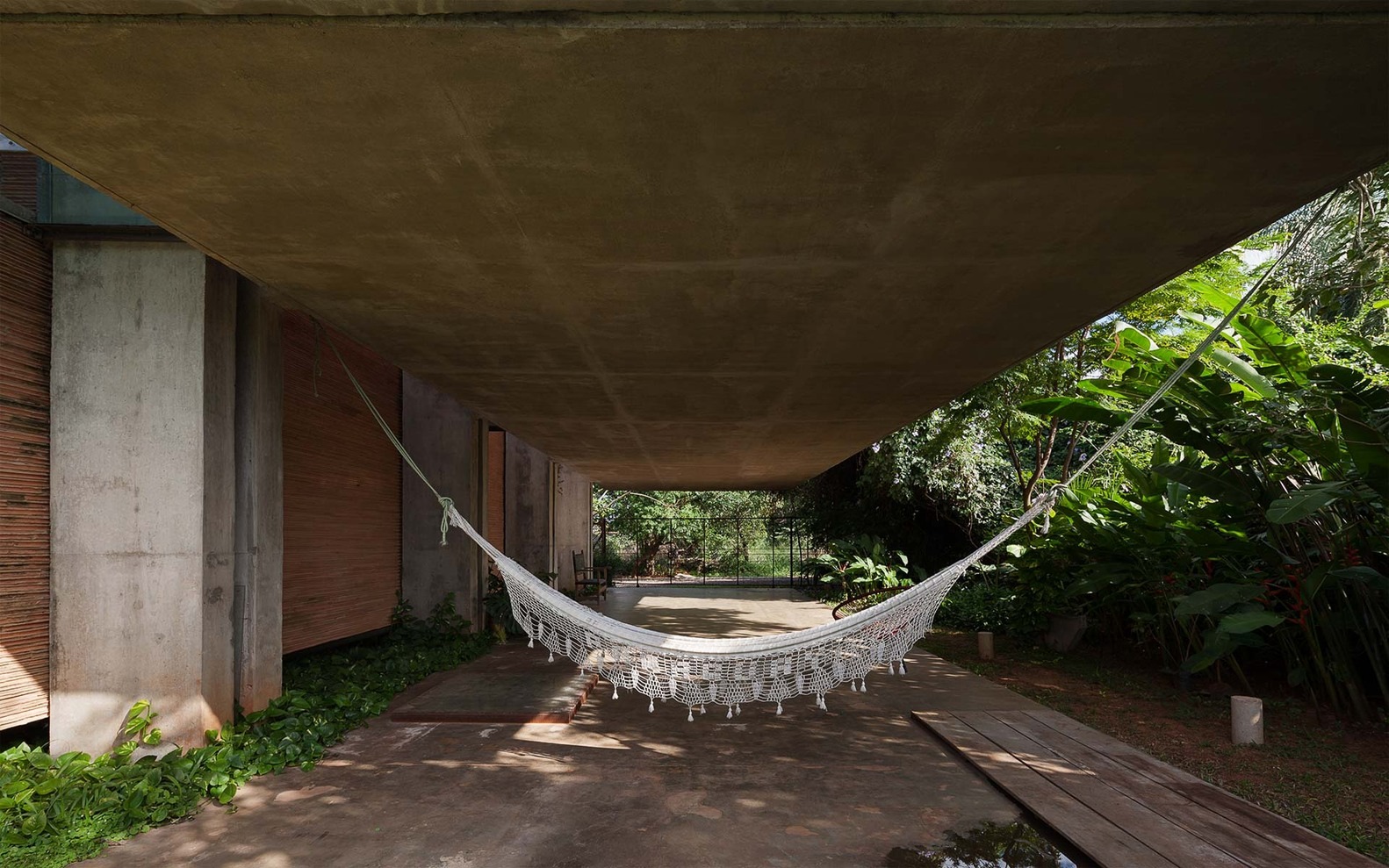 El cuerpo principal de la casa se sostiene casi como una balanza: un volumen opaco —con cocina, servicios, escalera— contrarresta el espacio habitable suspendido. Esa decisión estructural libera el terreno: permite que el jardín, el aire, y la vegetación ocupen el espacio bajo la casa.
