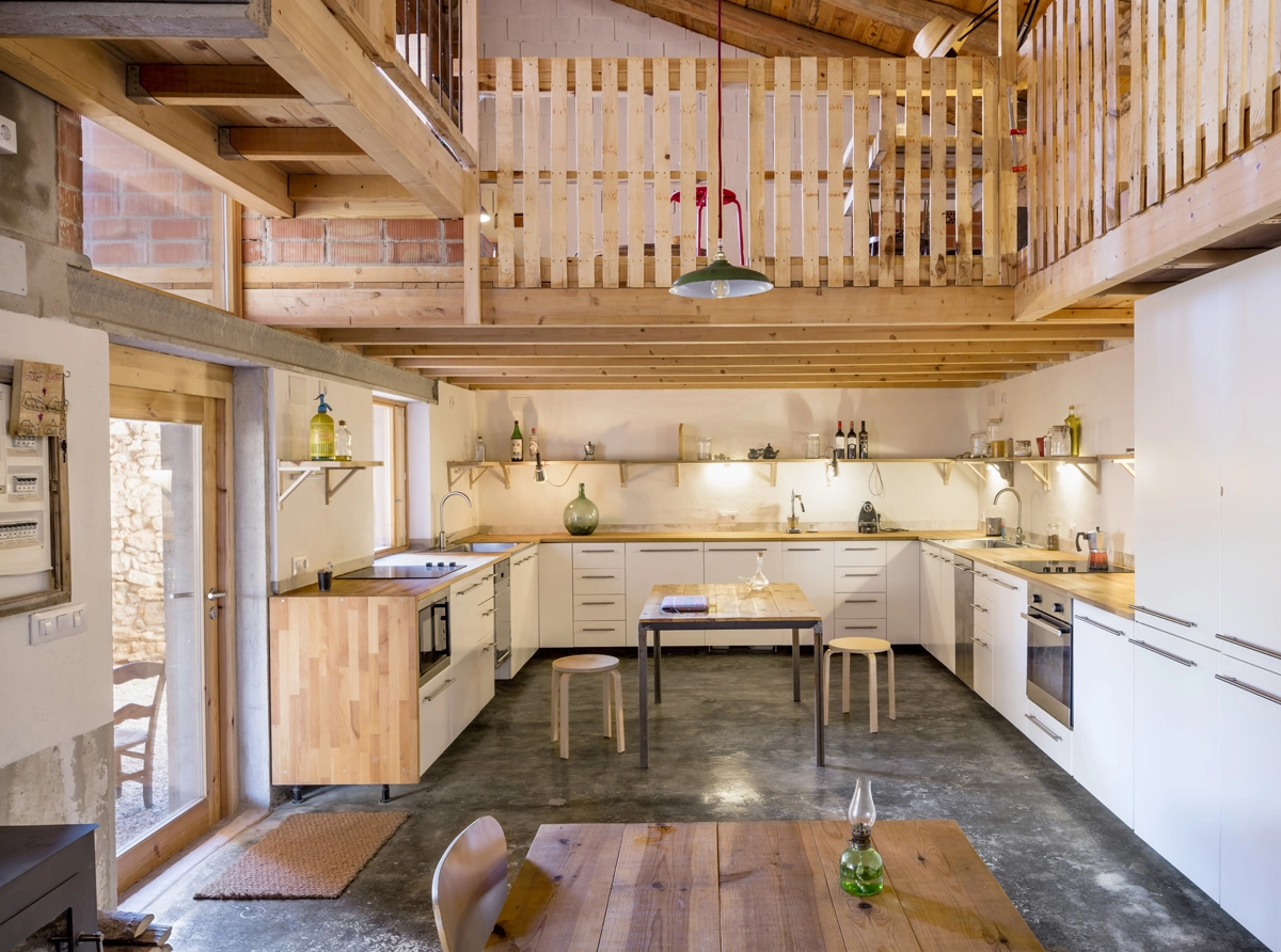 La casa ocupa el espacio de una antigua majada, de la que conserva muchas vigas de madera y los gruesos muros de piedra, que ayudan a mantener a raya el calor estival. Todo el programa de 230 m2 gira en torno al patio central, un gran salón polivalente abierto al exterior pero resguardado del sol al estar cubierto. Esta disposición facilita la ventilación, consiguiendo intimidad sin renunciar a las vistas al campo.