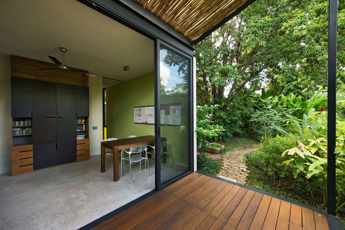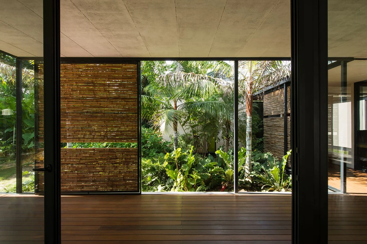Una amplia caja de vidrio permite una luminosidad extrema taimada a través de bambú de la región colocado en paneles corredizos-pivotantes enmarcados en perfiles metálicos.