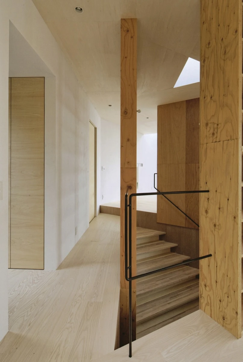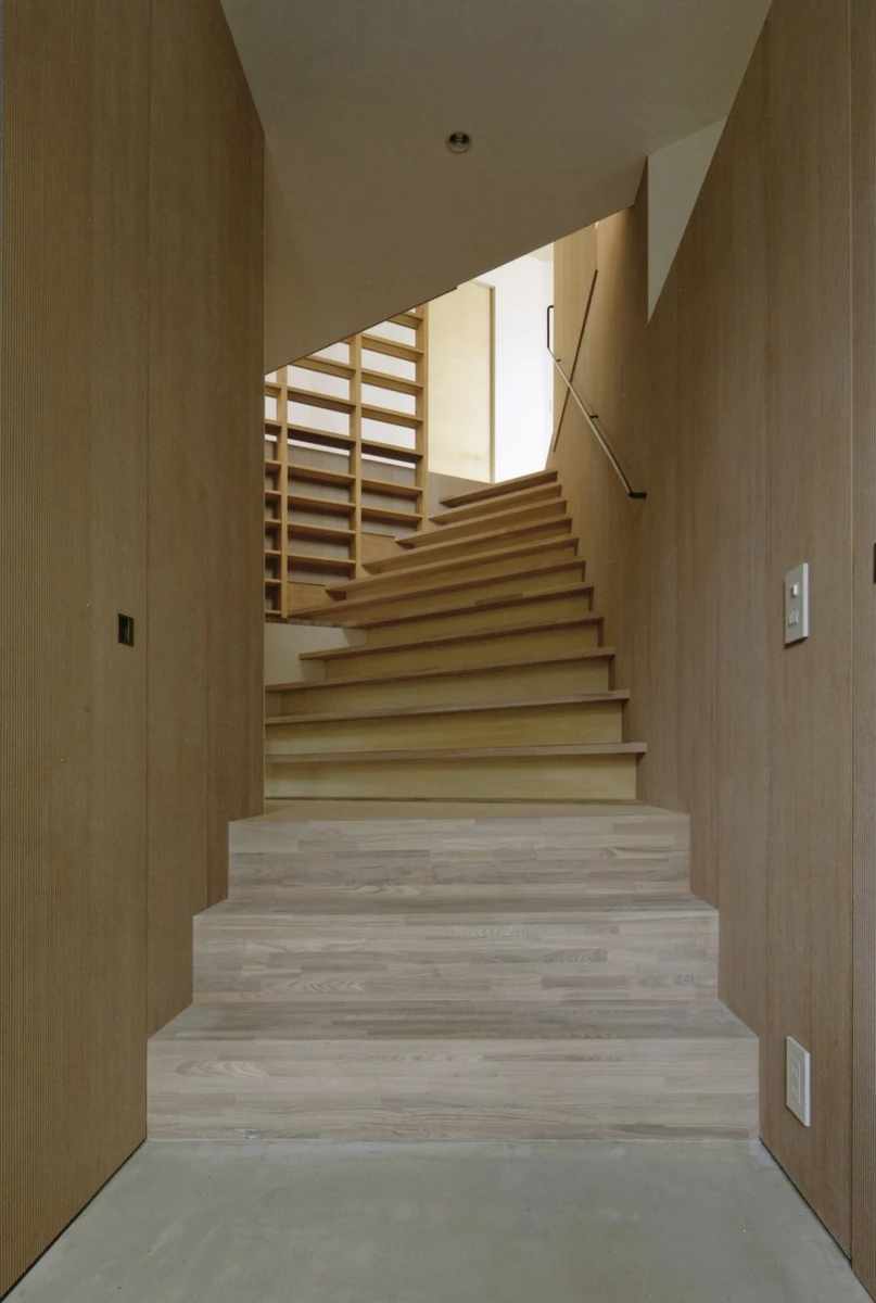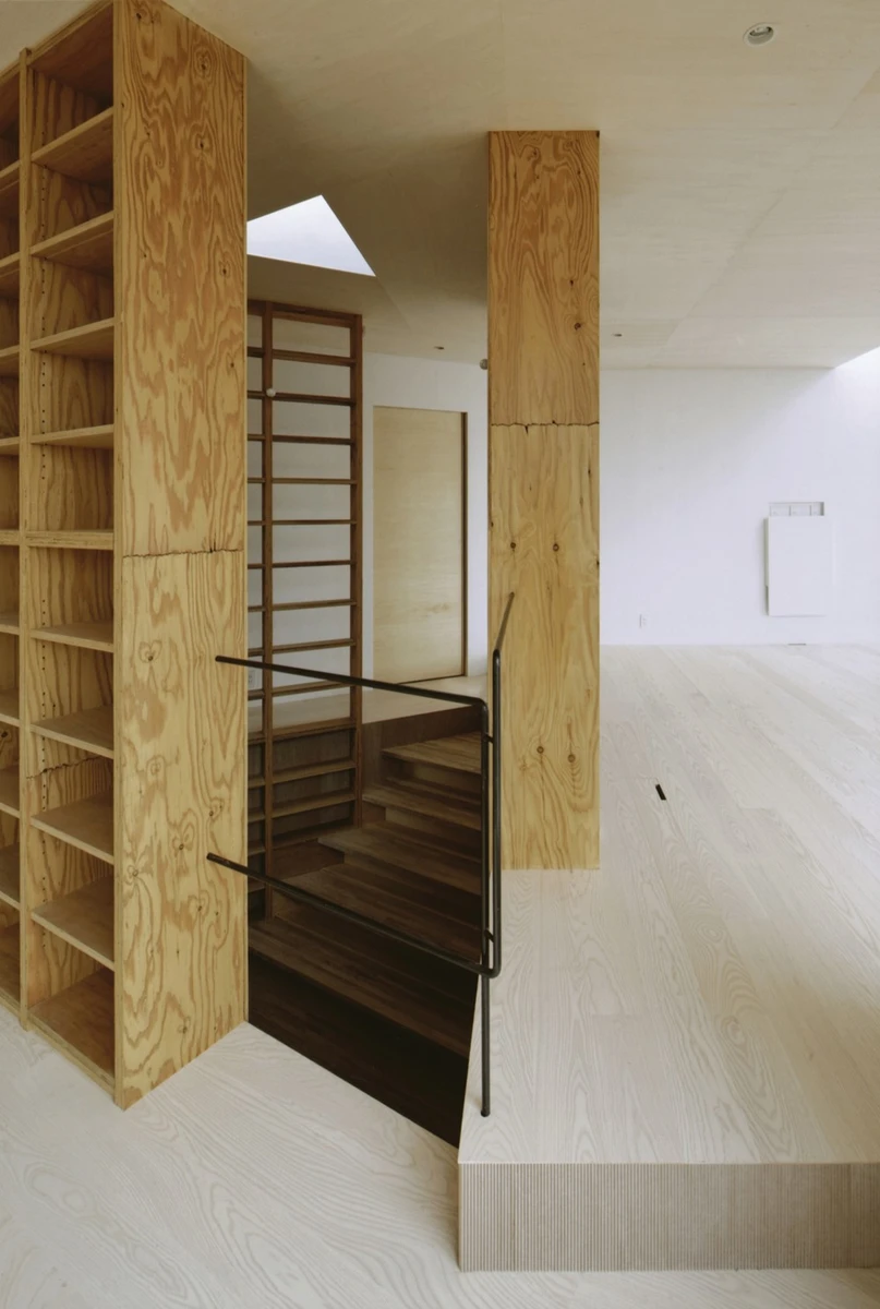 Otro volúmen al norte se destinó a zona de baño y el inferior, contiene las zonas privadas en la primera planta, y una terraza de madera, accesible desde la sala de estar, en la cubierta. Las escaleras se diseñaron con idéntica pendiente al terreno en la intersección de los tres volúmenes; además, el hueco de la escalera sirve como biblioteca y está diseñado para almacenar gran cantidad de libros.