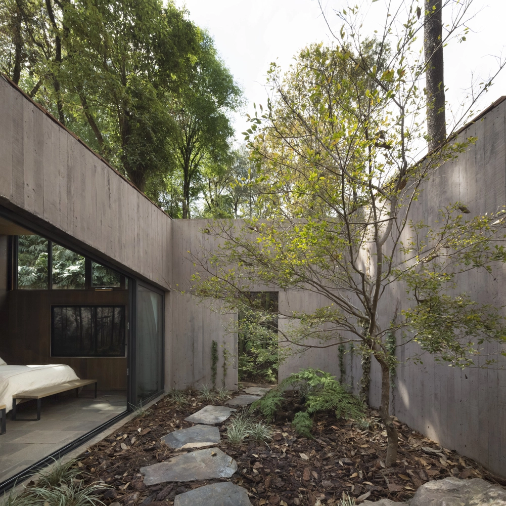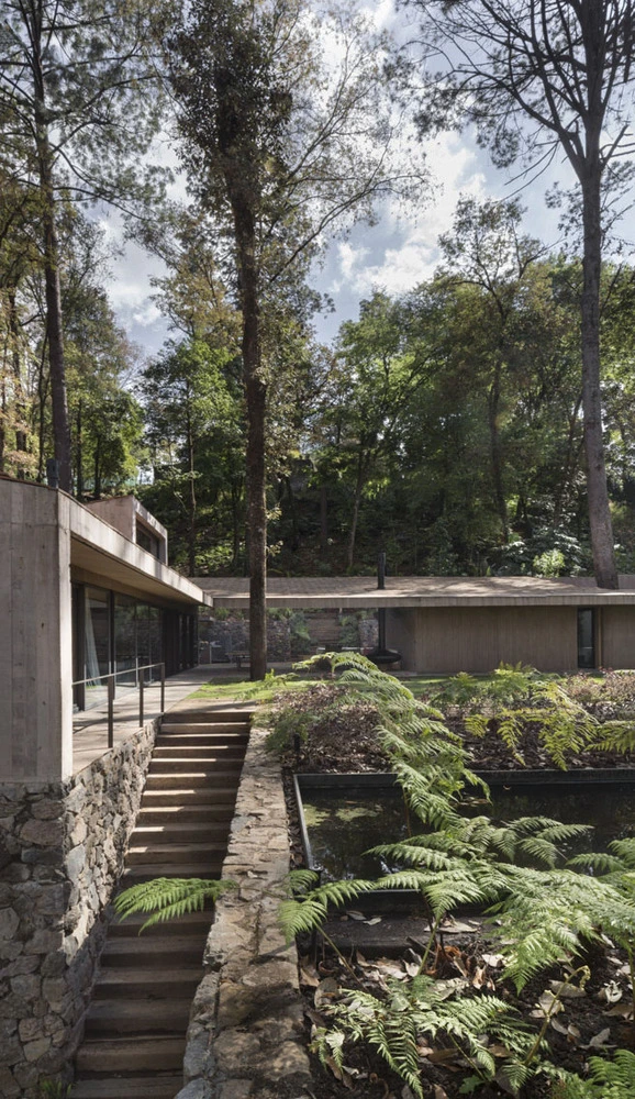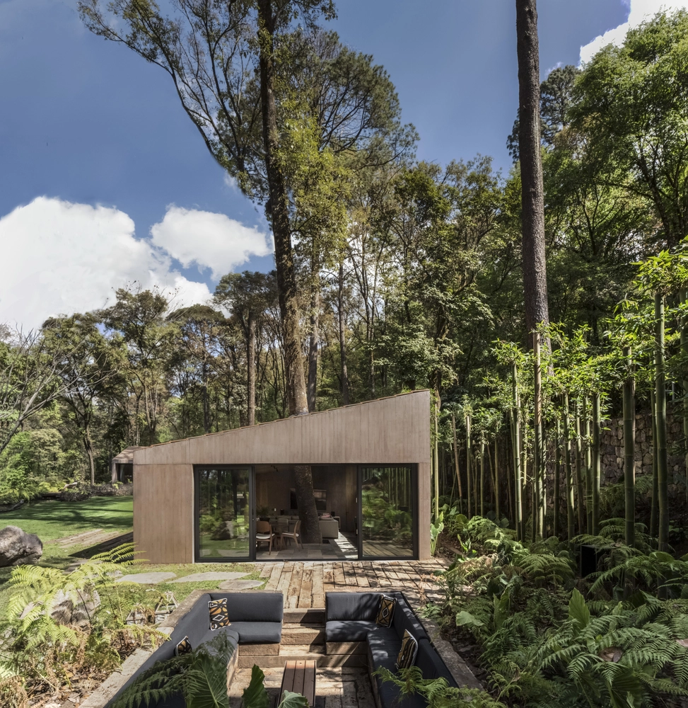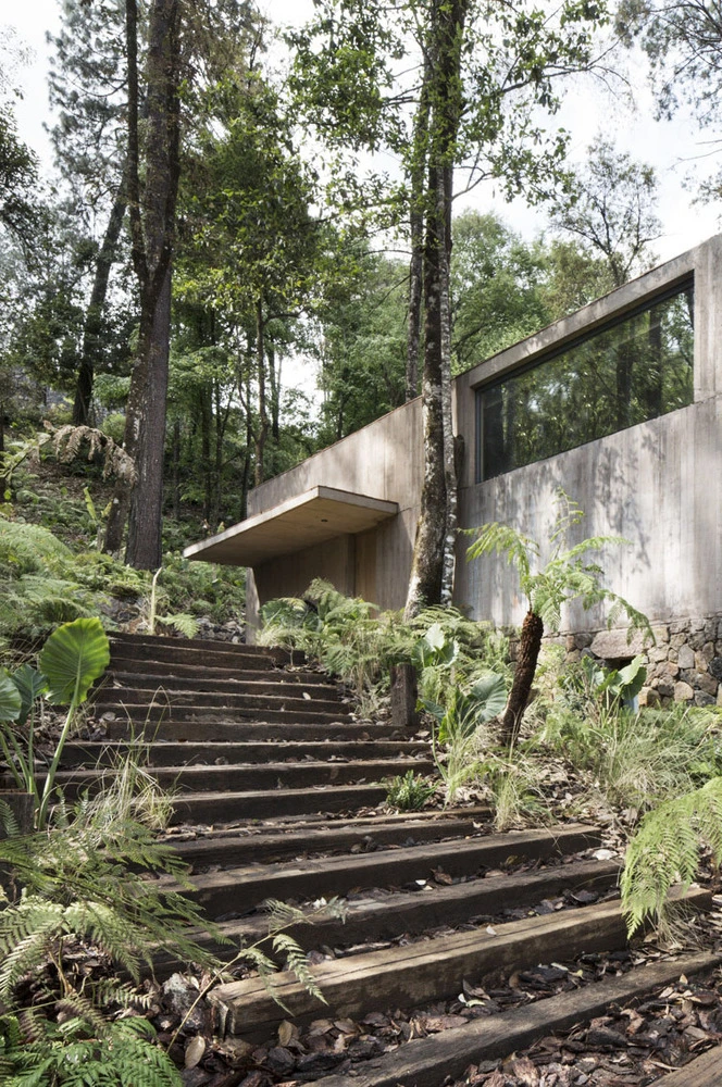 El estudio Dellekamp Arquitectos planteó el diseño de dos volúmenes independientes con una amplia terraza cubierta como punto de unión. El bloque paralelo a la inclinación de la ladera se reservó para los propietarios, mientras que el volumen destinado a los invitados se extiende casi perpendicular a la pendiente. Es este último el que integra varios árboles, instalándose uno de ellos en el mismo centro de la sala de estar, toda una osadía visual.