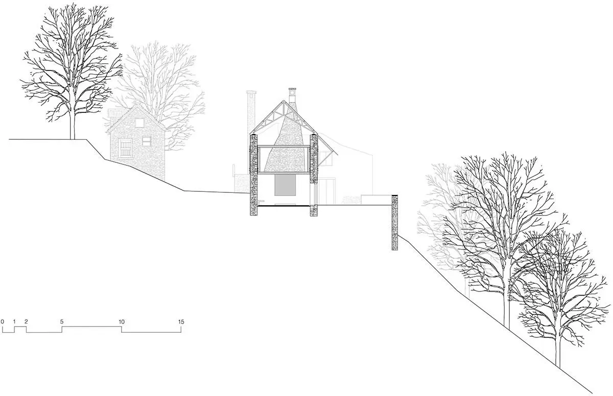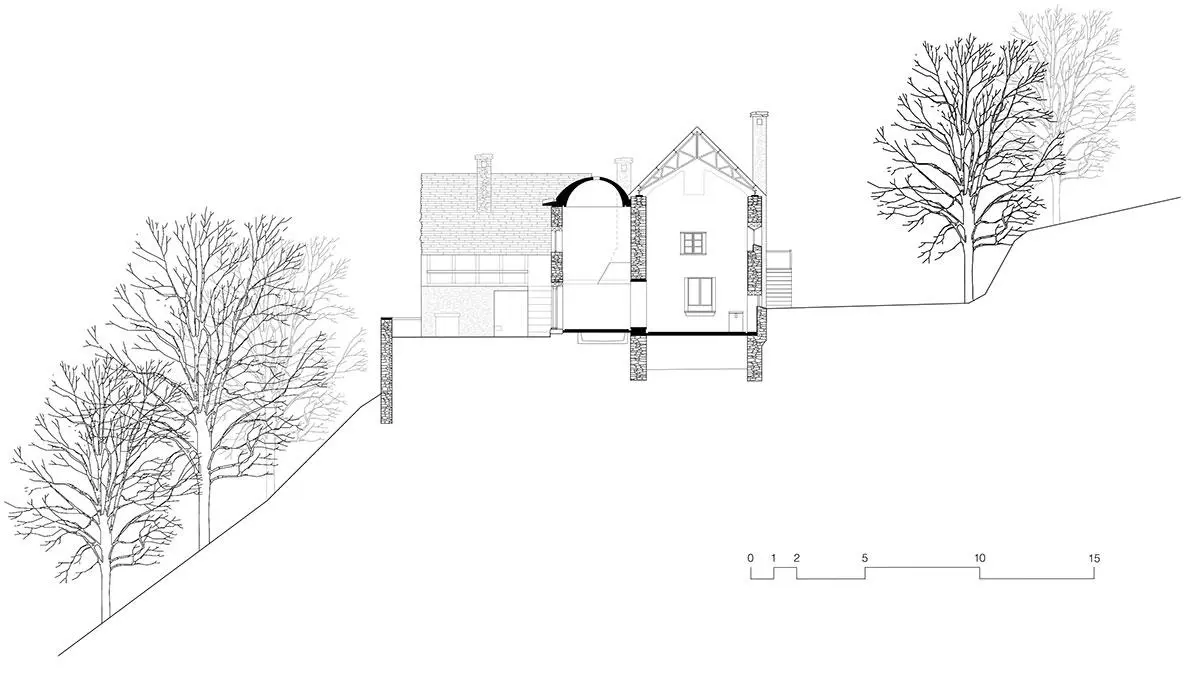 Los usos de cada habitación original se deducen fácilmente en el piso superior, mientras que más abajo destacan las piedras desnudas de la bodega. Un gran marco doble de metal refuerza las paredes rescatadas y encuadra la chimenea.