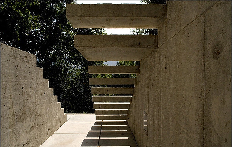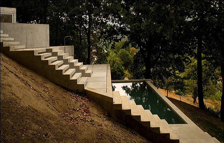 El terreno presenta fuerte inclinación y una configuración particular: es largo y angosto. Está mirando al sur lo que le permite recibir una exposición solar óptima y disfrutar de una particular vista natural. El proyecto se configura con varios volúmenes de hormigón visto que, cual cascada por la ladera, se fragmentan y adaptan a la orografía de la parcela proyectando un resultado natural.