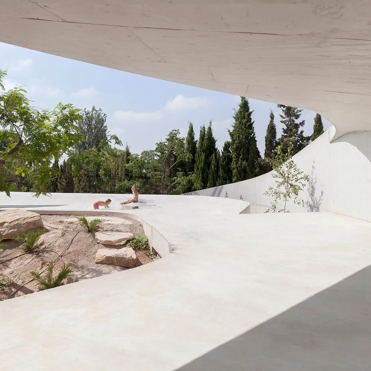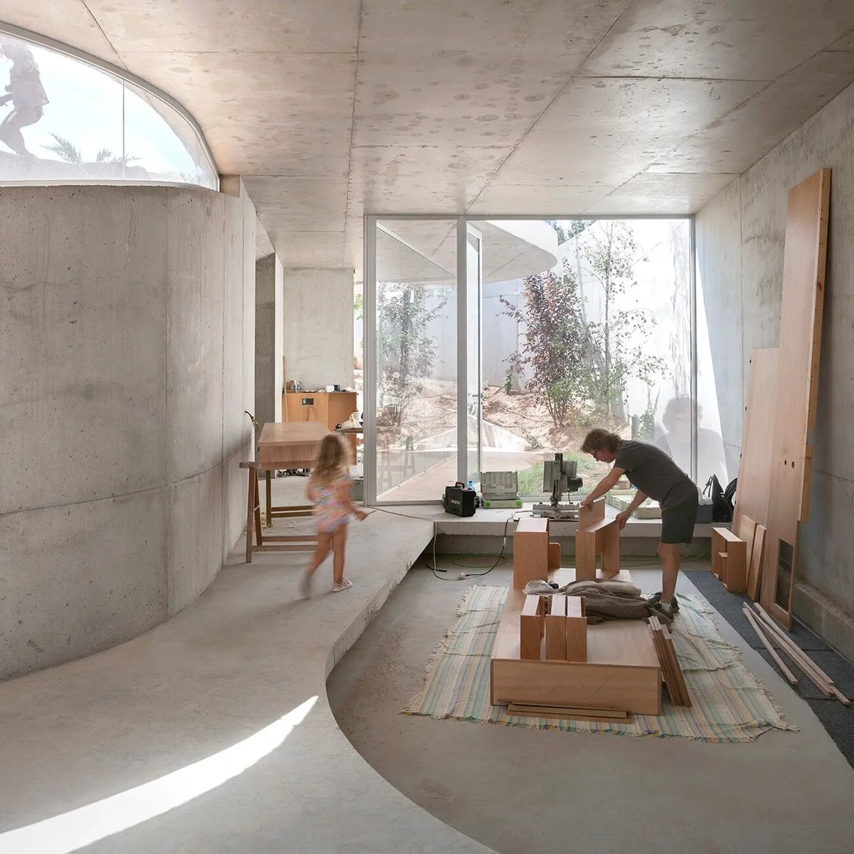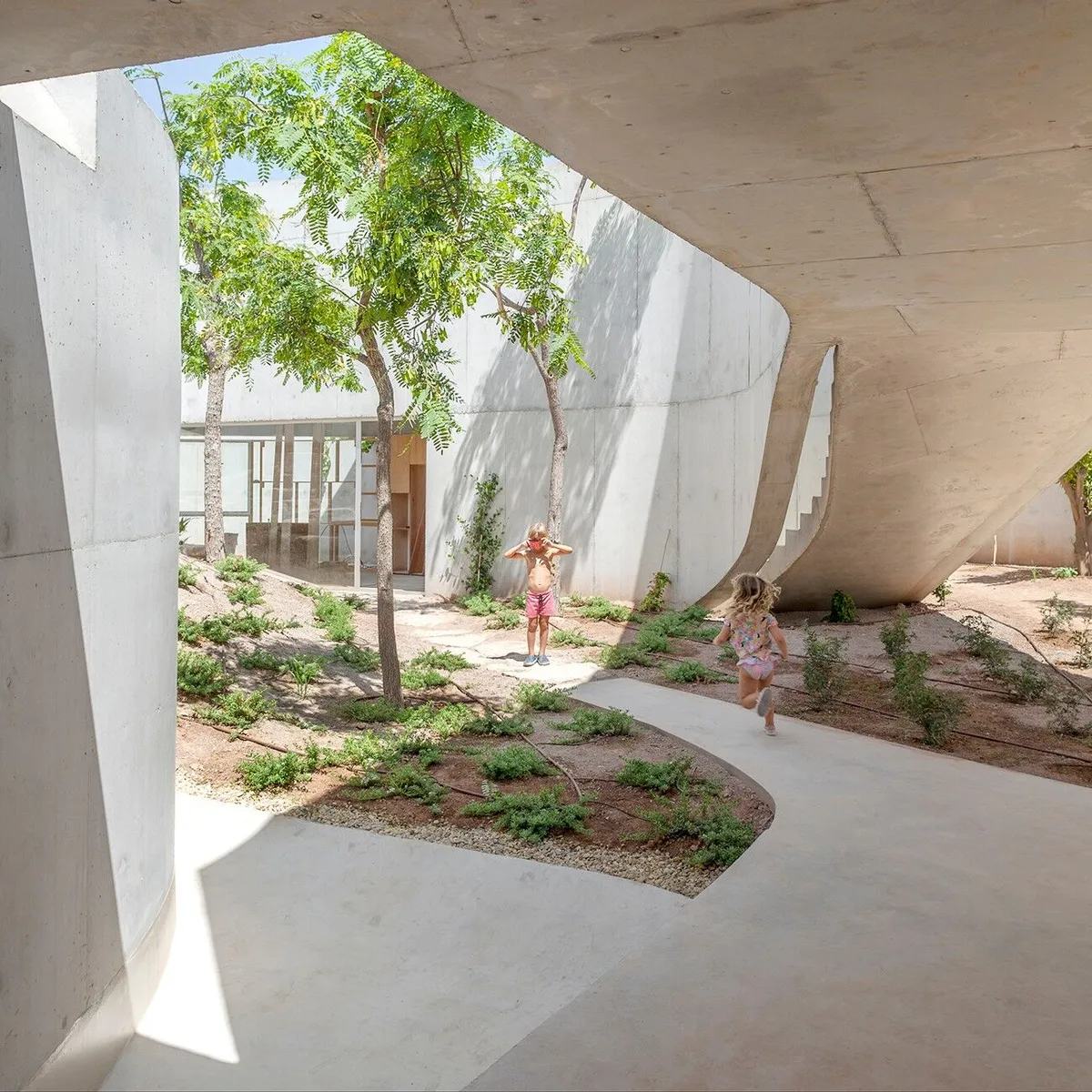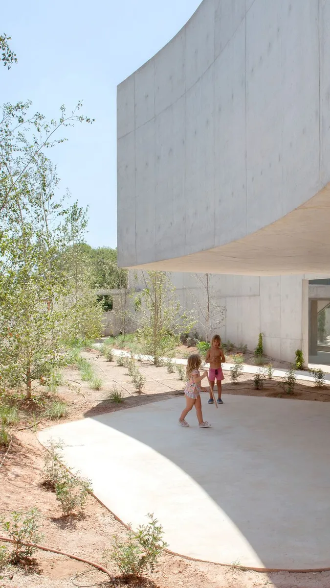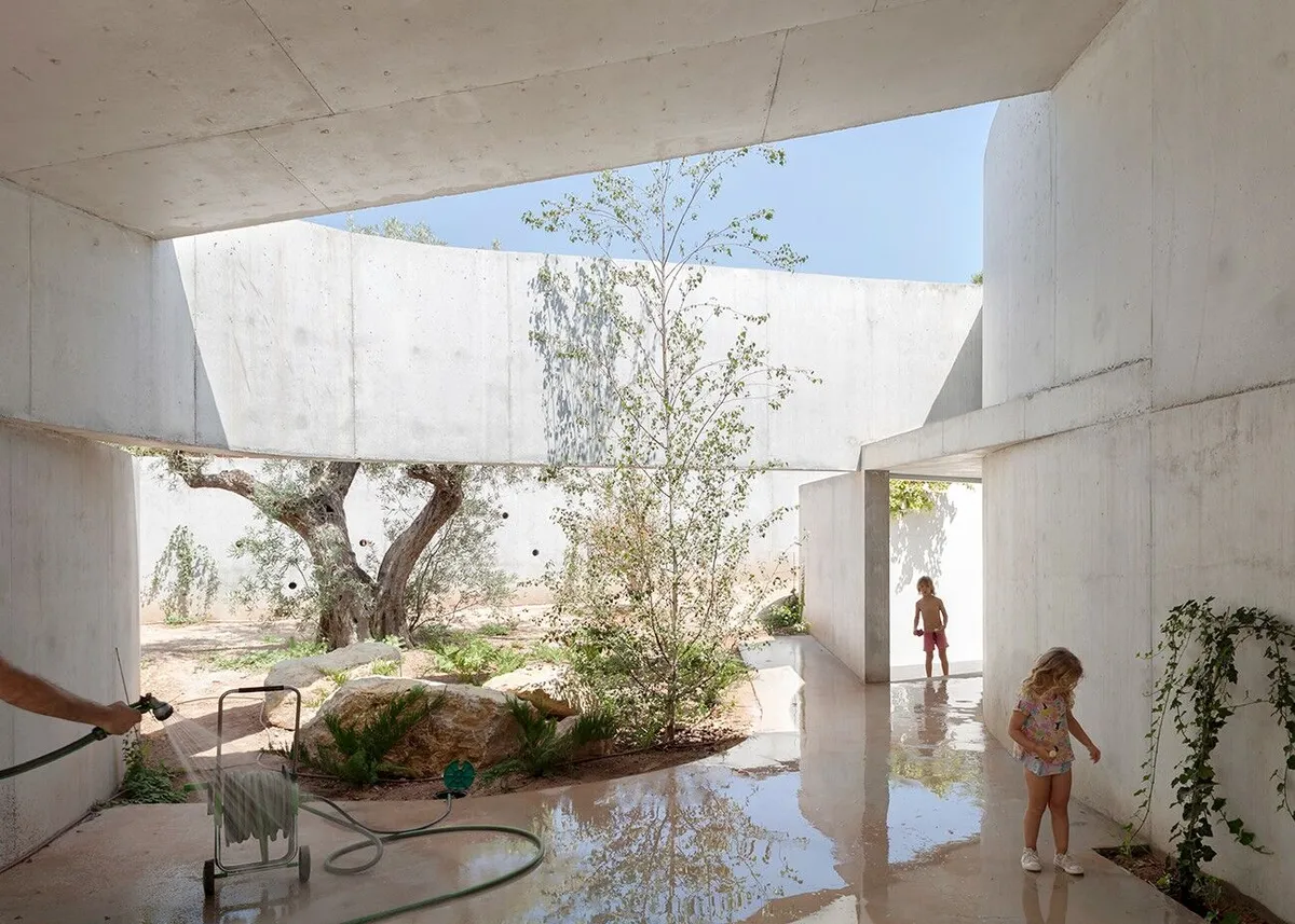 Con su sucesión de rectas y curvas, la Casa Toto se entrelaza con las zonas verdes en un diseño laberíntico y orgánico. Los huertos y los cítricos del jardín conviven con aljibes donde almacenar el agua de lluvia para riego o pasarelas que se elevan y caen. La propia piscina es un patio inundado más, cincelada por muros de hormigón visto con esencia brutalista.