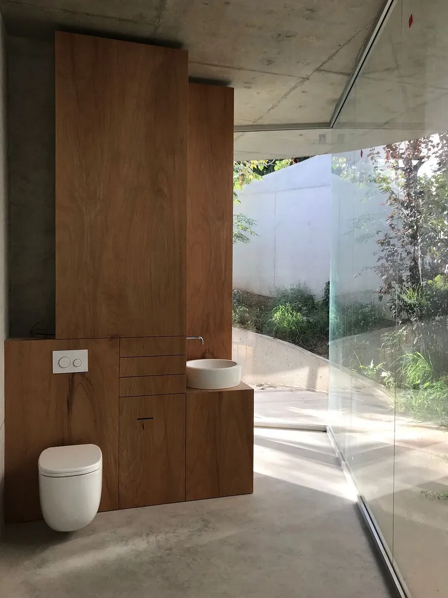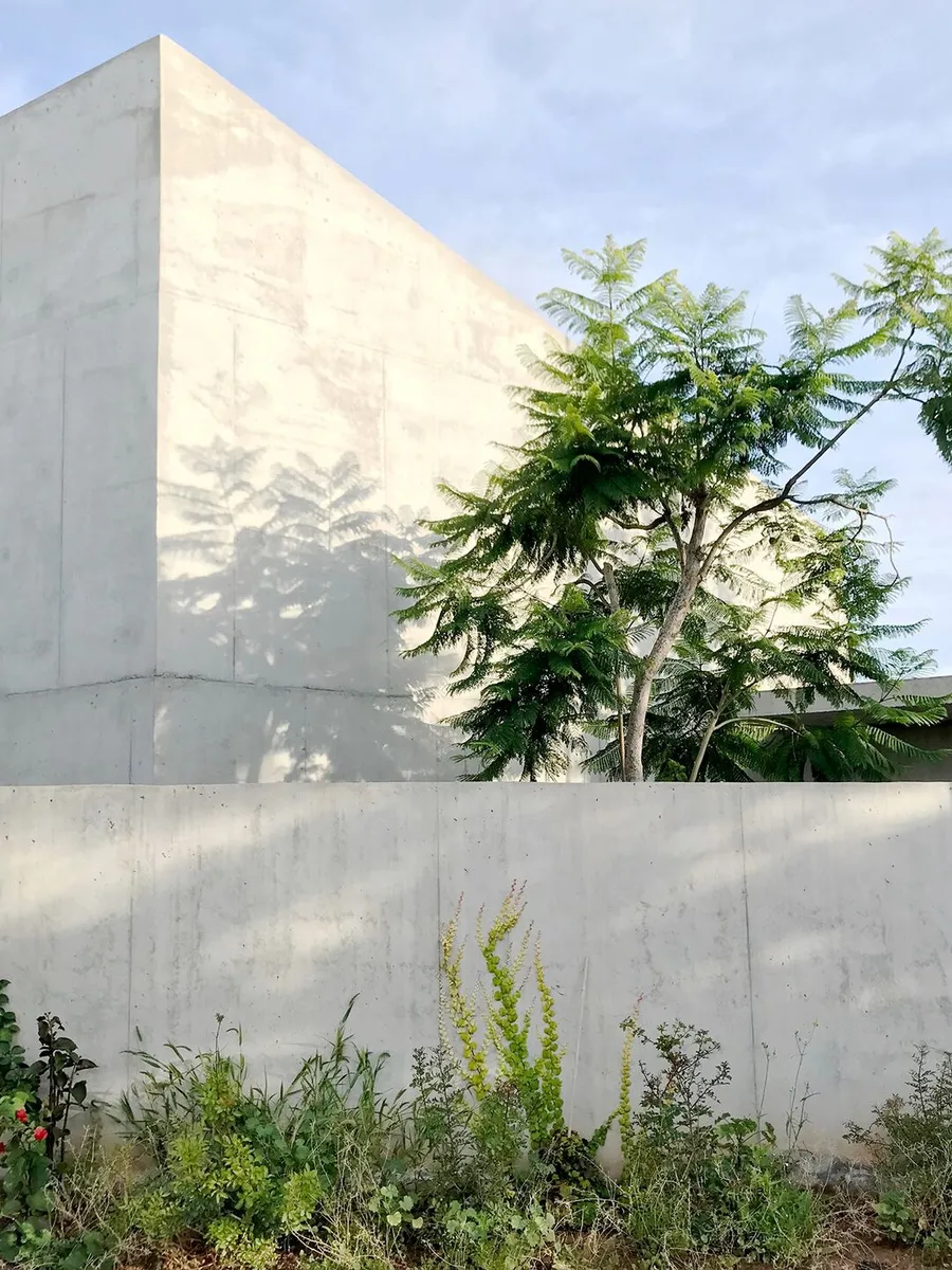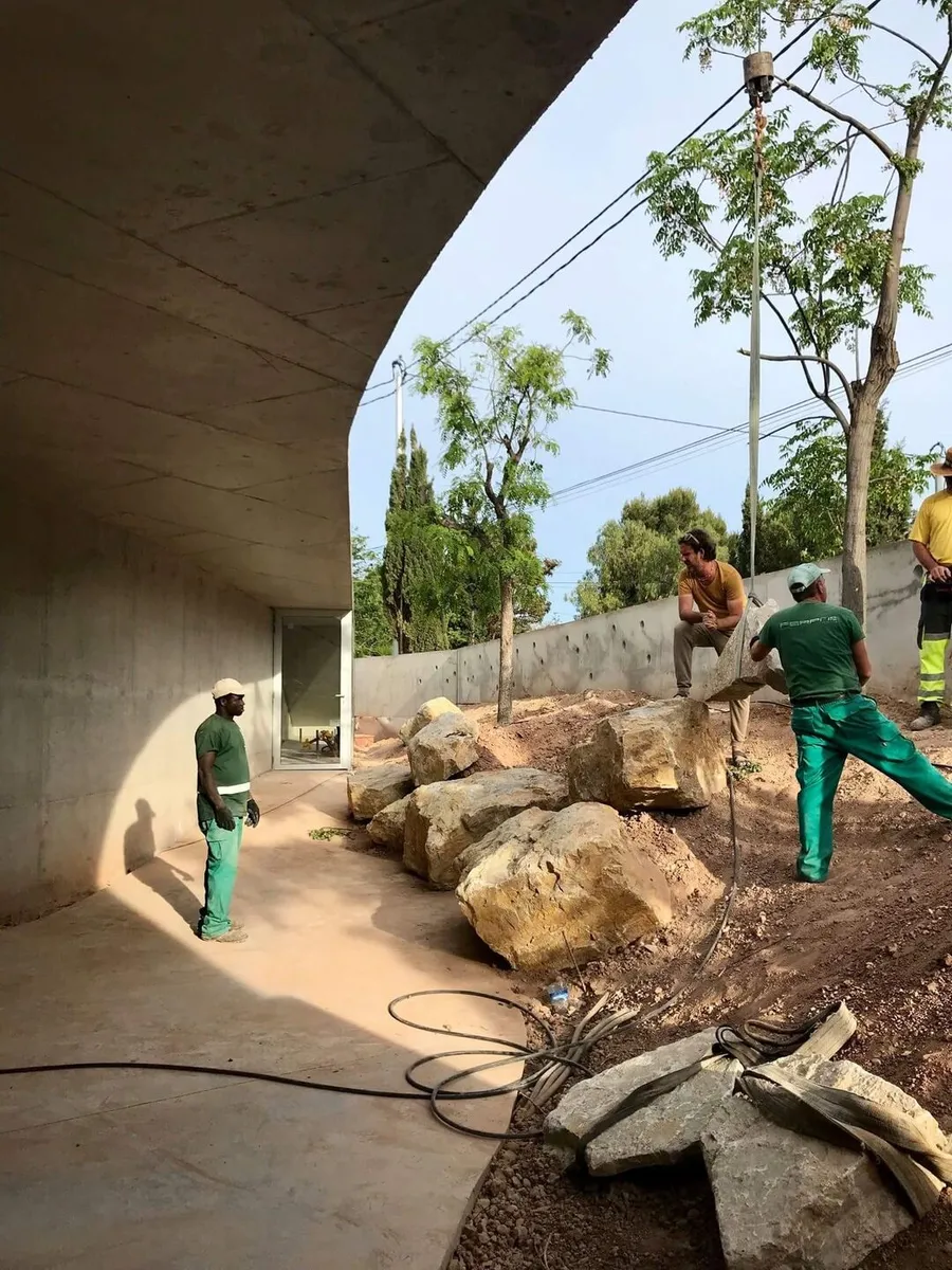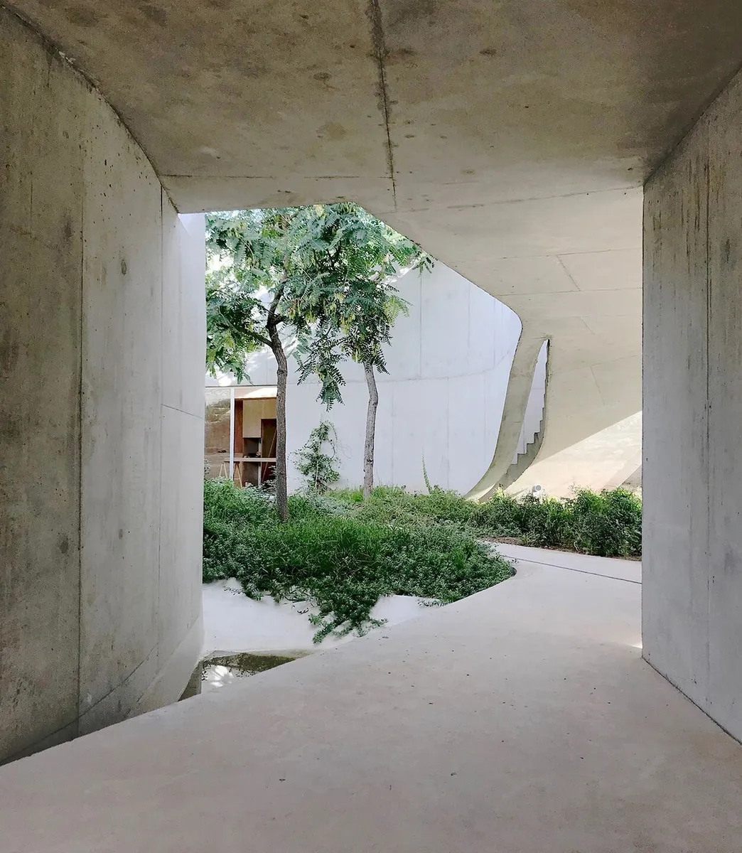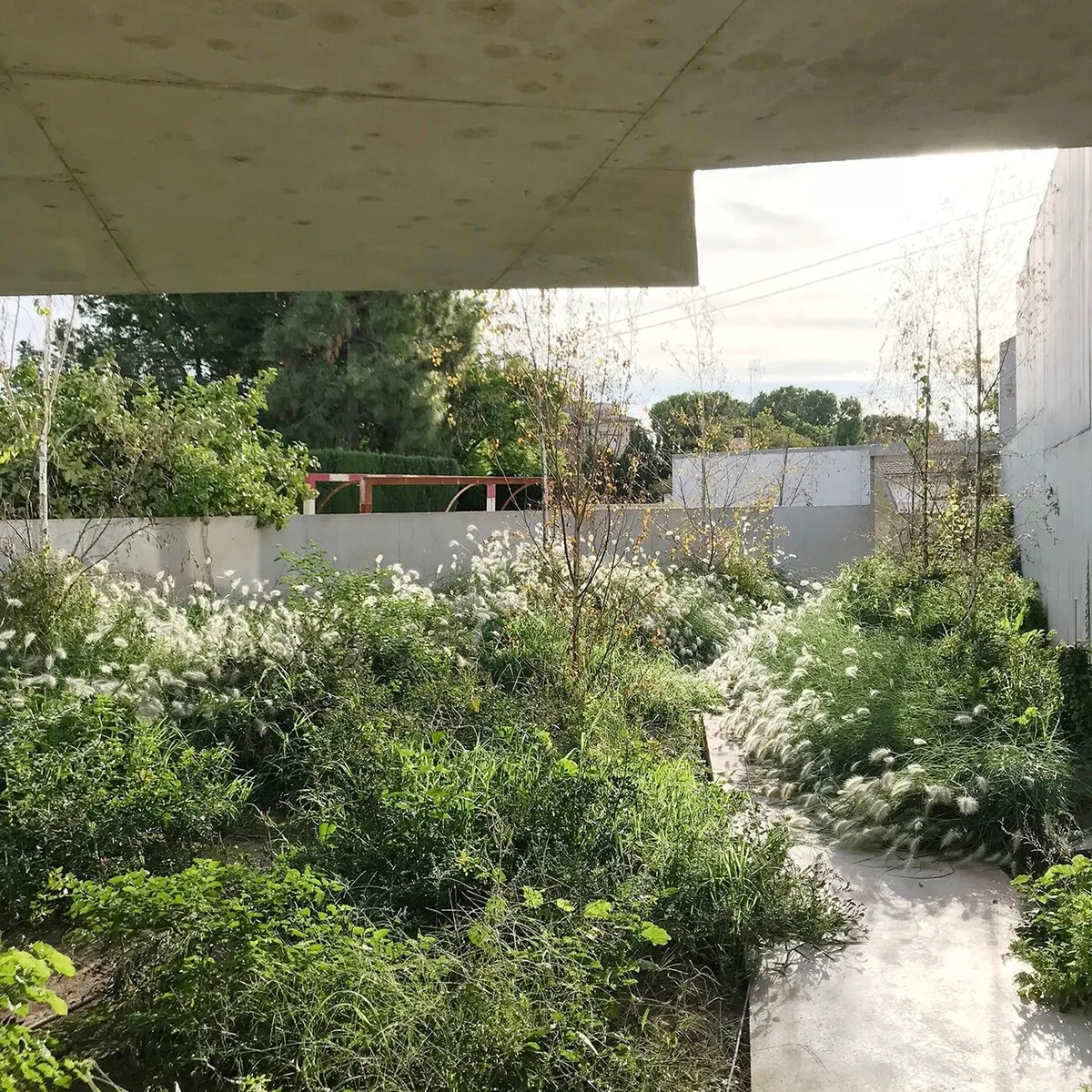 Con su sucesión de rectas y curvas, la Casa Toto se entrelaza con las zonas verdes en un diseño laberíntico y orgánico. Los huertos y los cítricos del jardín conviven con aljibes donde almacenar el agua de lluvia para riego o pasarelas que se elevan y caen. La propia piscina es un patio inundado más, cincelada por muros de hormigón visto con esencia brutalista.