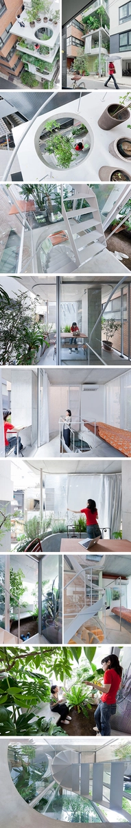 No existe, pues, una fachada convencional. Ésta se convierte en un jardín que actúa como parapeto entre la ciudad y el interior, filtrando miradas y luz. Jardineras de terracota e incluso un pequeño espacio de tierra en el bajo son los elementos responsables de crear este fragmento de naturaleza en la urbe. Otro de los soportes que actúan de límite exterior son los cerramientos de vidrio, que obligan –bien es cierto- al uso de climatización convencional. Las cortinas actúan también como pared, aportando su capacidad de movimiento y ligereza. Y de hecho, en una parte de la casa funcionan también como separador de espacios para crear una sala de reuniones. La escalera, de proporciones mínimas, recorre como una espina dorsal los cuatro niveles encajonados entre medianeras, y los atraviesa a través de aberturas en el hormigón realizadas con la característica precisión japonesa. En la última altura, un segundo hueco sirve para que crezca y prospere un árbol situado en el tercer nivel.