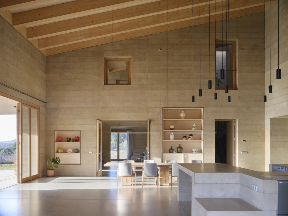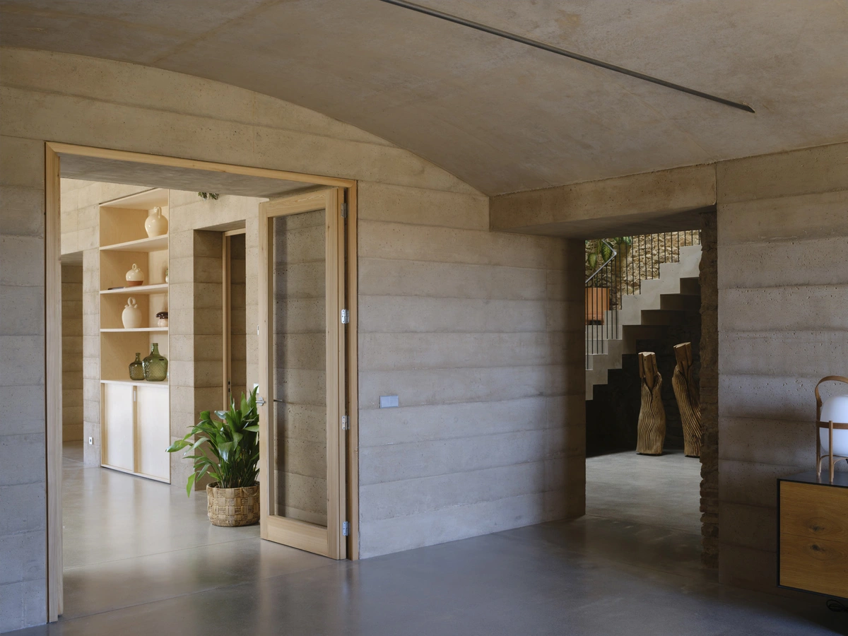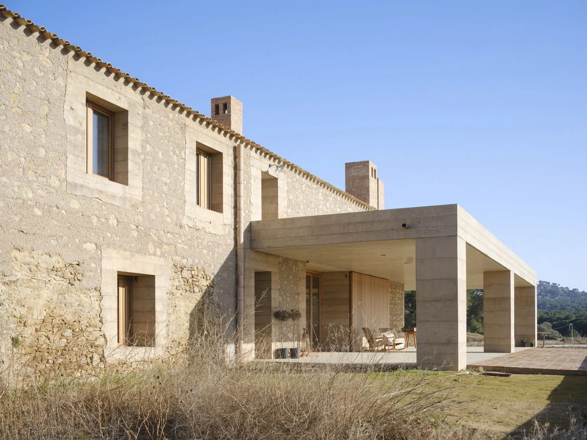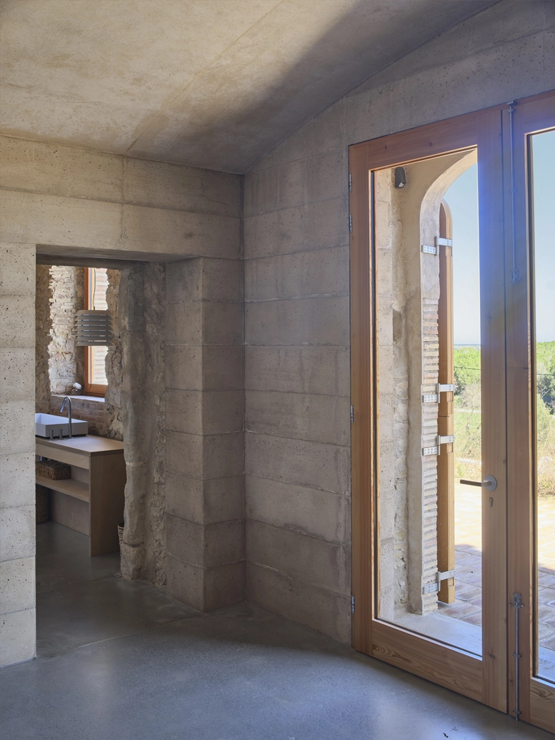 El diseño estructural de la casa se basa en una retícula ortogonal de salas sucesivas, conformadas por gruesos muros de carga de concreto y nuevas bóvedas estructurales. La cubierta, de teja y soportada por una estructura de madera vista, recupera la altura original de la edificación, creando un volumen sencillo a dos aguas que se integra perfectamente en el entorno rural.