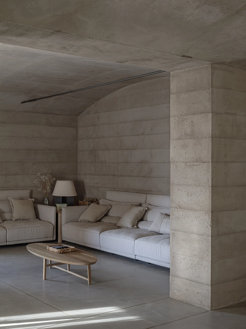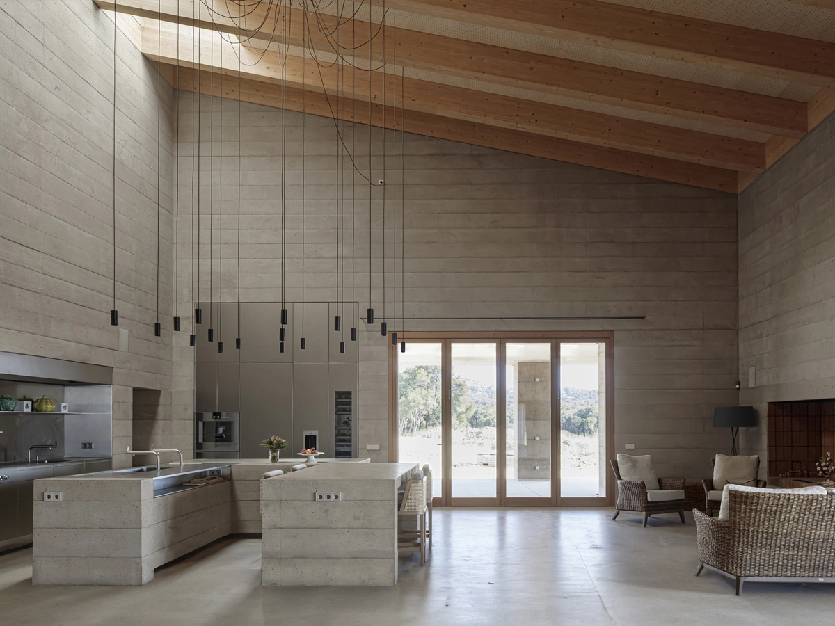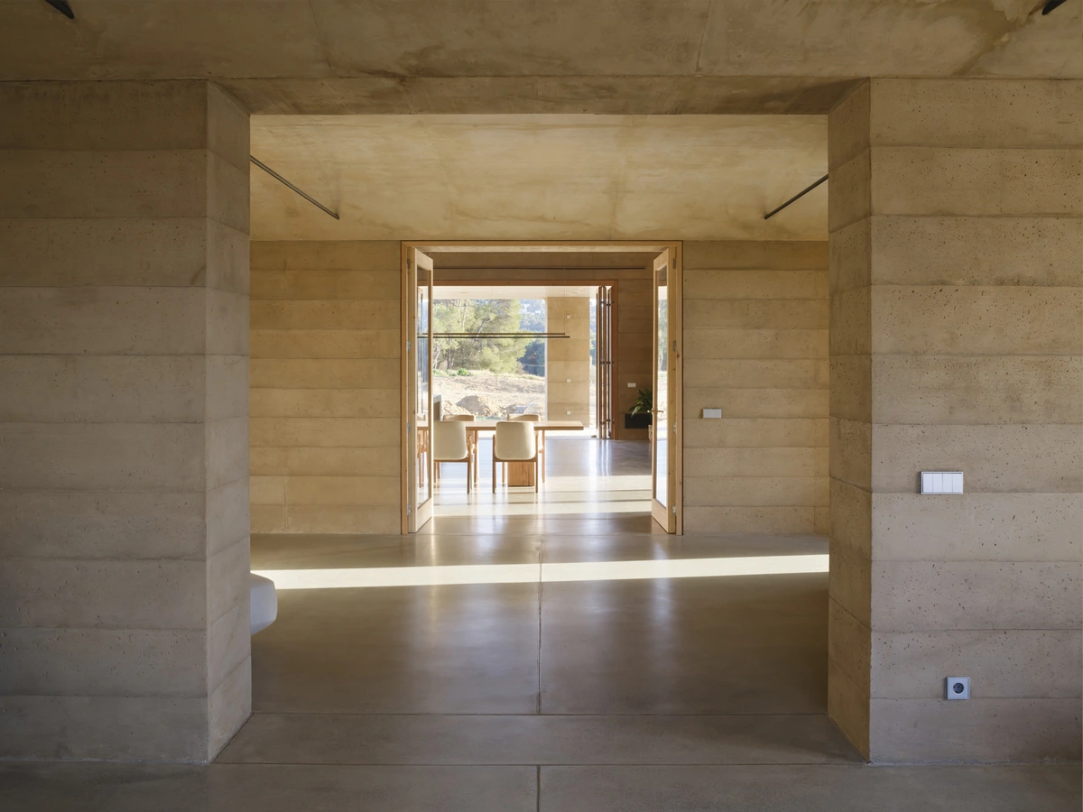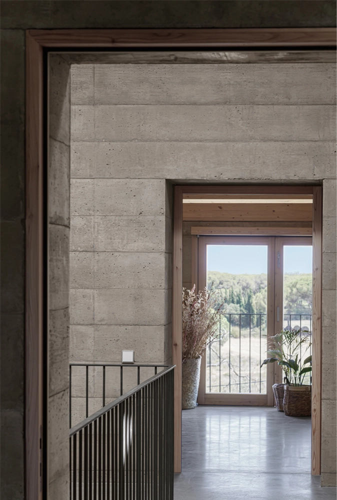 El diseño estructural de la casa se basa en una retícula ortogonal de salas sucesivas, conformadas por gruesos muros de carga de concreto y nuevas bóvedas estructurales. La cubierta, de teja y soportada por una estructura de madera vista, recupera la altura original de la edificación, creando un volumen sencillo a dos aguas que se integra perfectamente en el entorno rural.