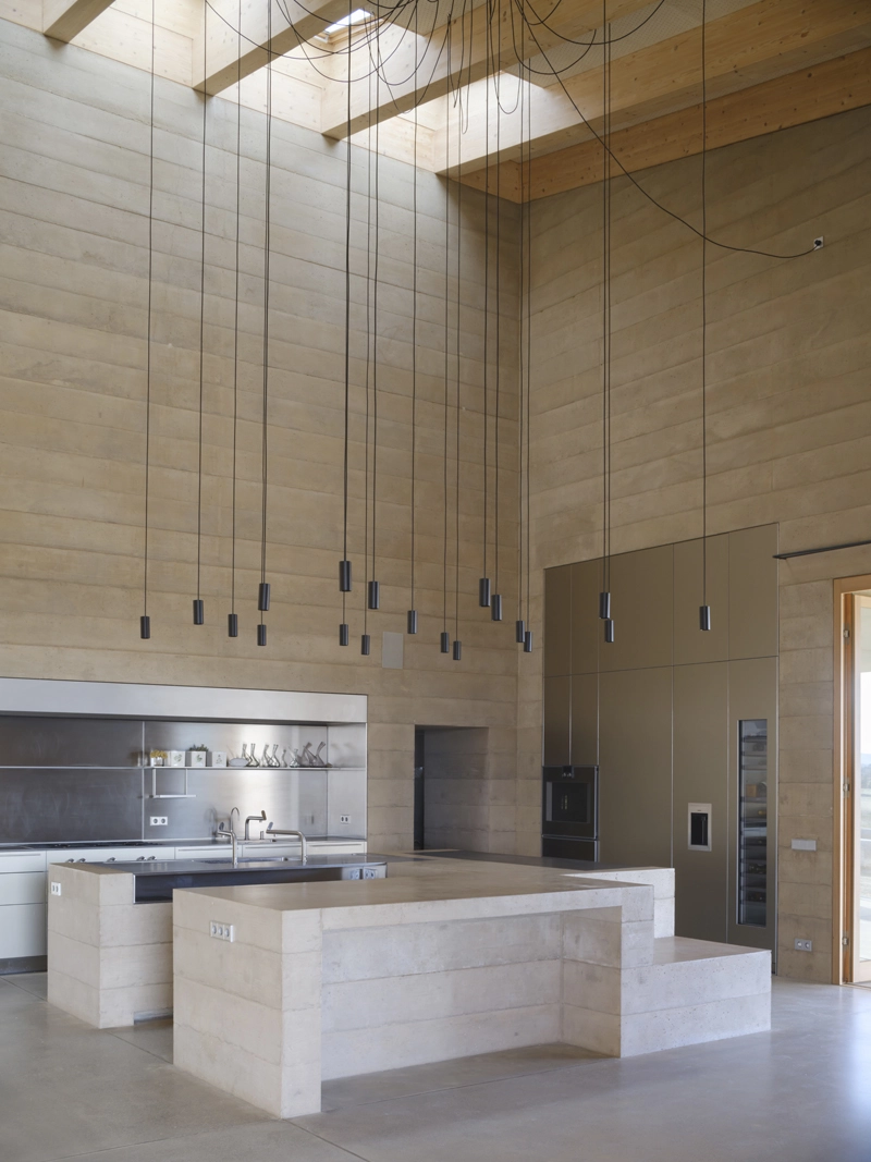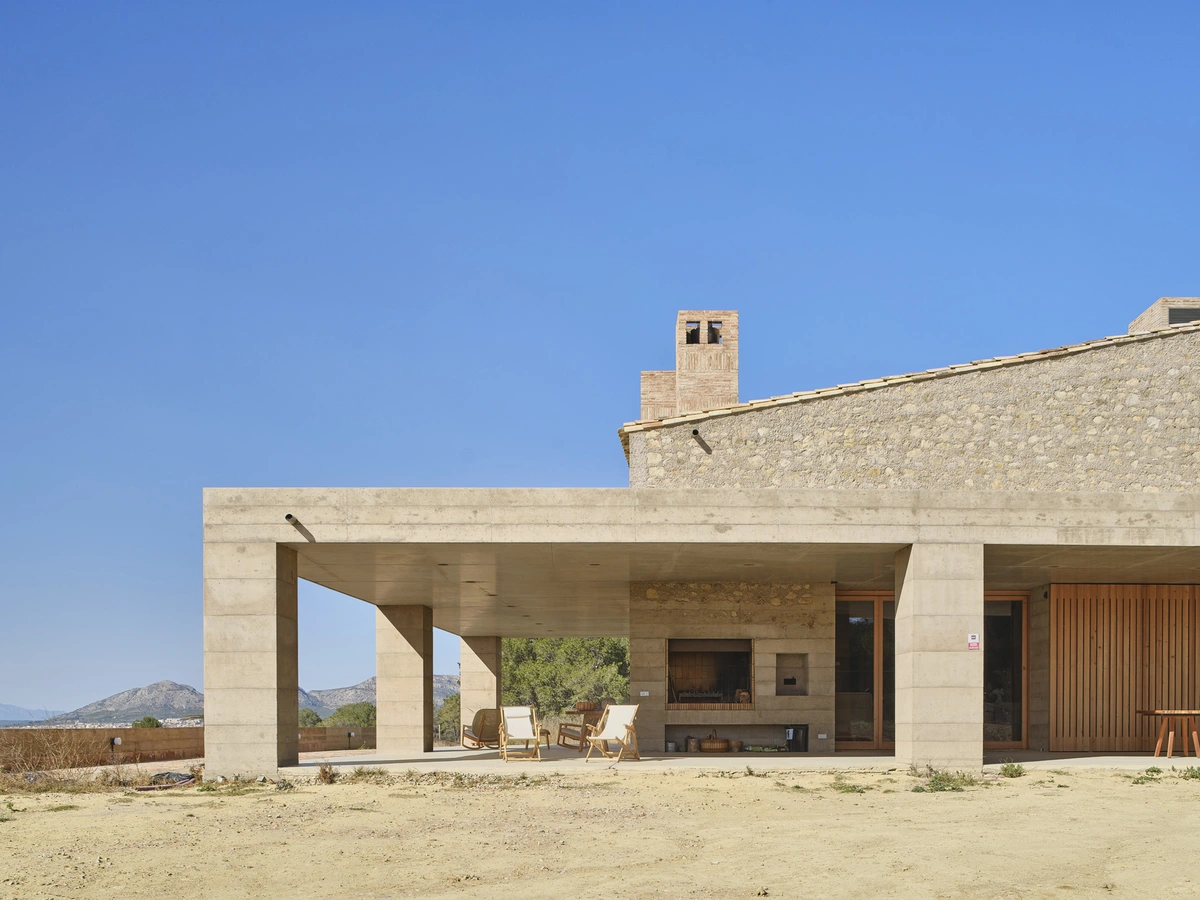 La relación de la casa con su entorno se expresa también a través del gran porche en forma de L, que extiende la cocina hacia el exterior, conectando la vida interior con el paisaje agrícola y los viñedos. Este espacio no solo controla la incidencia solar, sino que también proporciona un lugar de contemplación y disfrute del entorno natural.