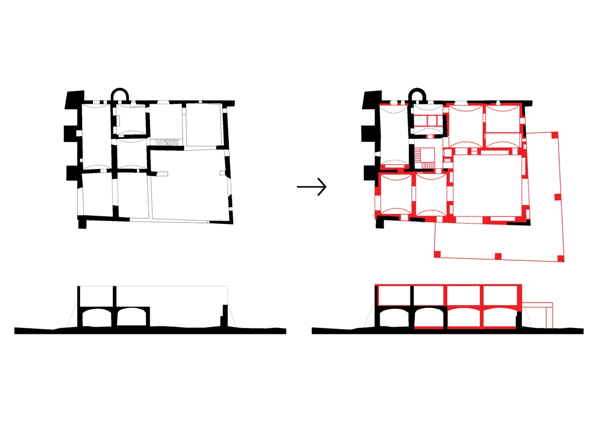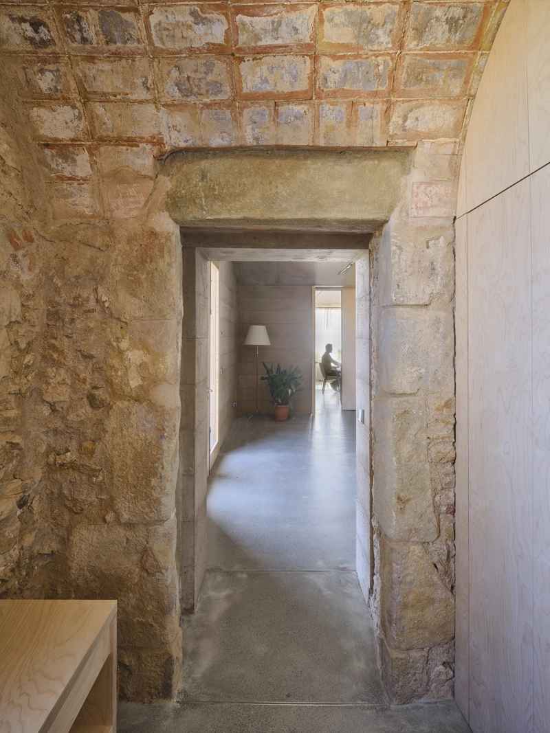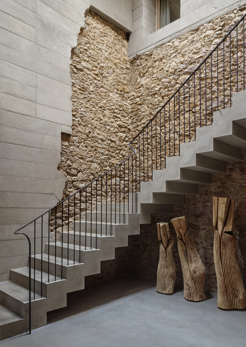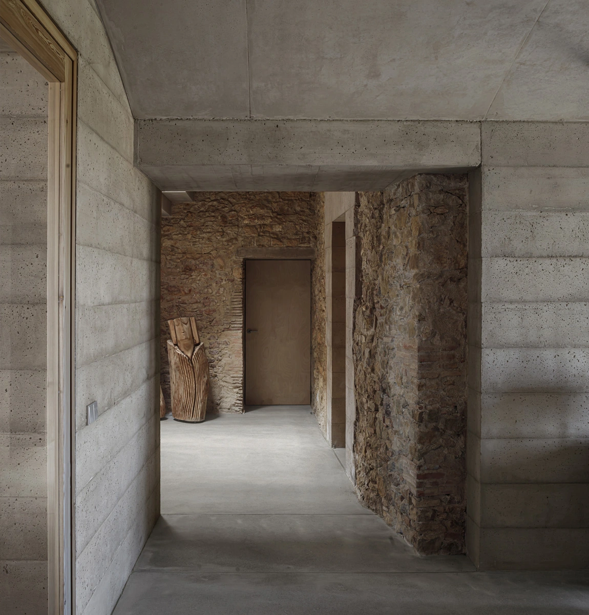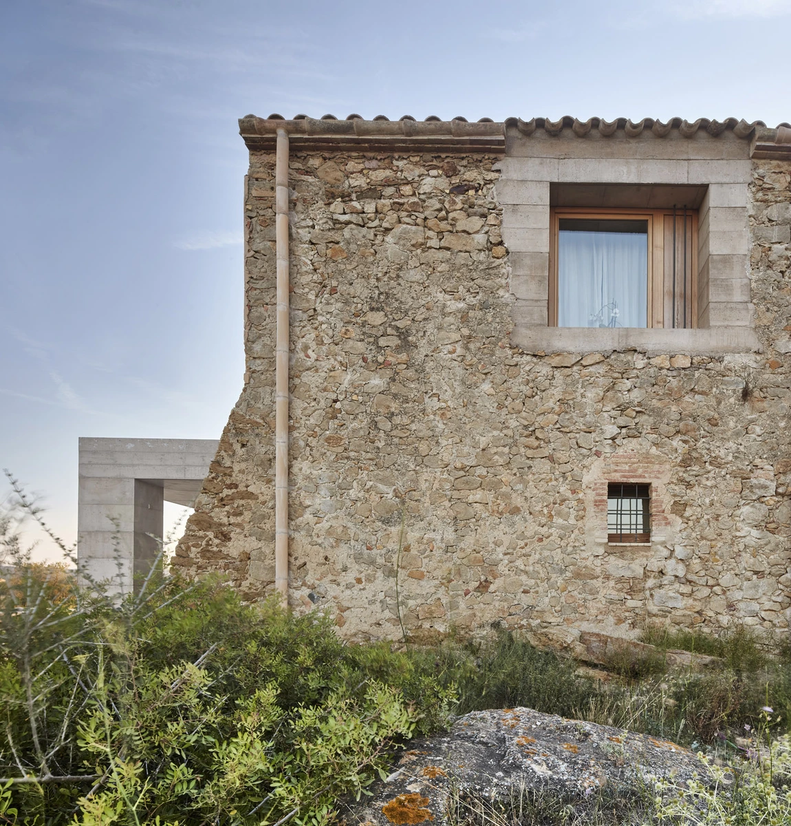 La intervención respeta las dos fachadas de piedra originales, preservando su esencia histórica. Estas fachadas, ubicadas al norte y al este, fueron consolidadas y rehabilitadas, mientras que las nuevas paredes de hormigón, que incorporan piedras originales, completan el volumen en los lados sur y oeste.