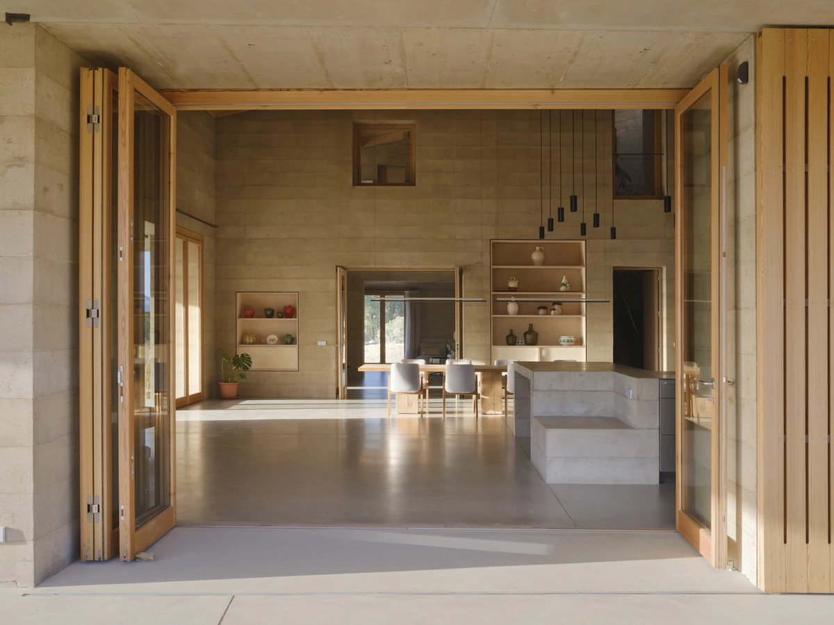 Casa 1627 destaca por su enfoque en la sostenibilidad. Los muros de hormigón, vertidos en estratos de 25 cm y aligerados con arlita, proporcionan inercia térmica, contribuyendo a la eficiencia energética de la casa. Este sistema pasivo se complementa con un suelo radiante geotérmico y un sistema de ventilación subterránea que ayuda a mantener una temperatura amable durante todo el año.