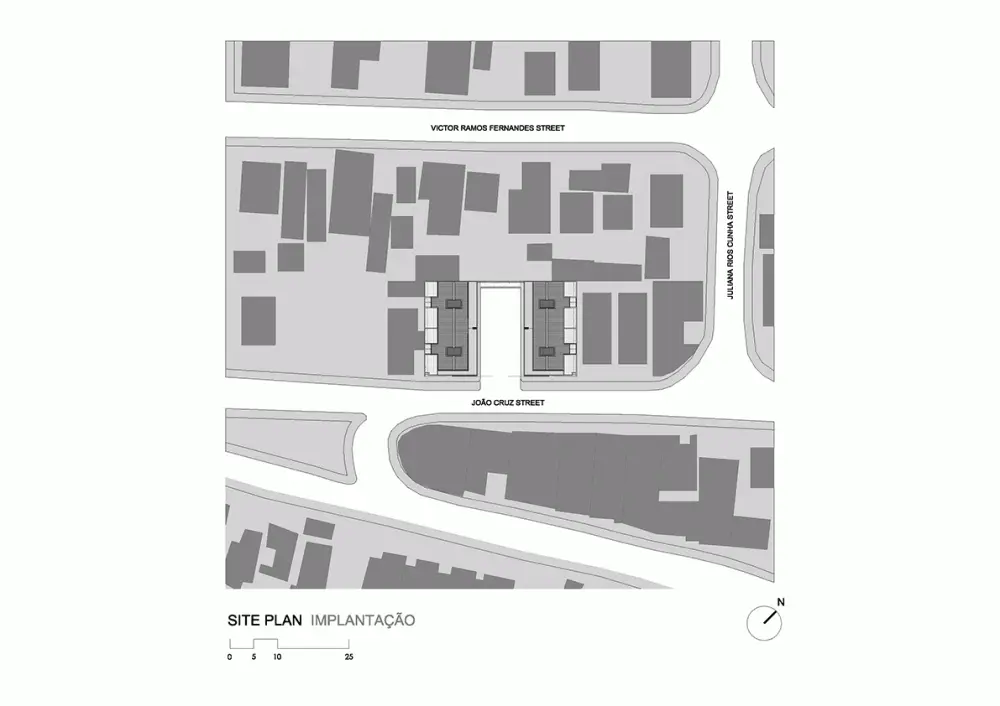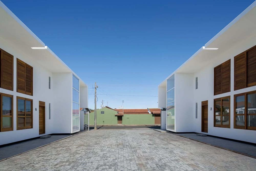 La implementación de las Casas AV explora la posibilidad de agrupar el conjunto de ocho unidades de vivienda en dos grupos cuya posición en el suelo delimita un espacio intermedio que se convertirá en el centro del diseño. Contemplando la necesidad del aprovechamiento más eficiente posible de su potencial constructivo y preservando las áreas internas de cada una de las unidades previstas en el proyecto, la composición de los límites construidos y no construidos configura el patio central colectivo, de grandes proporciones para un terreno de estas dimensiones.