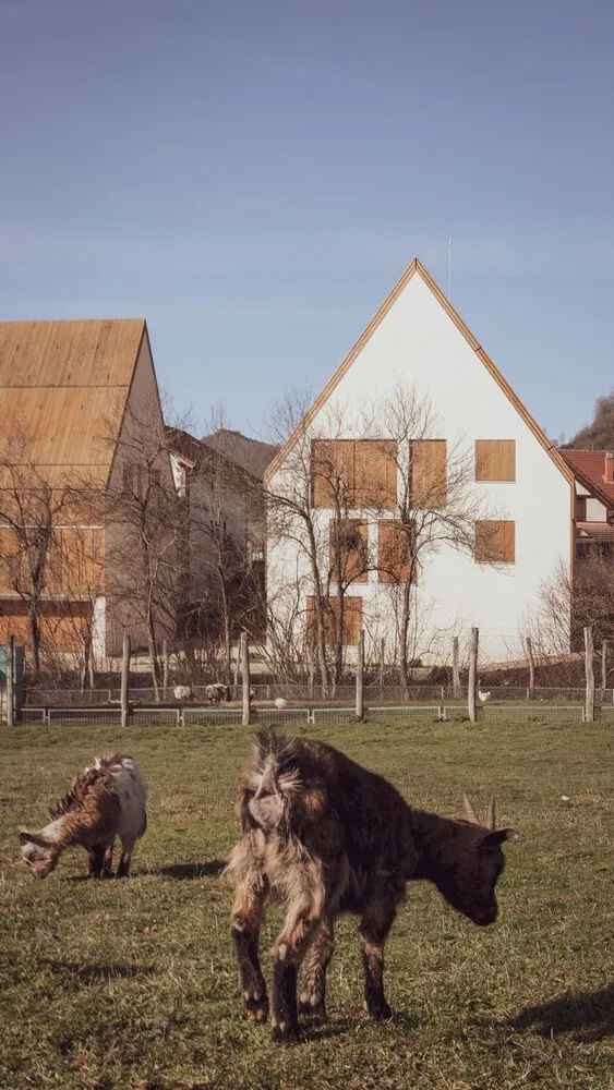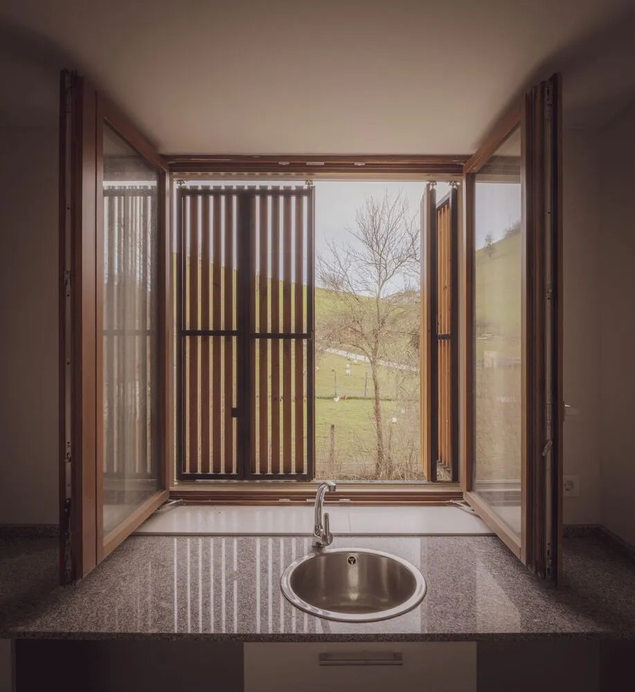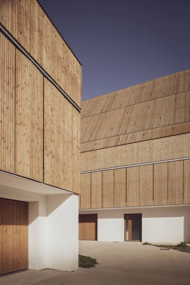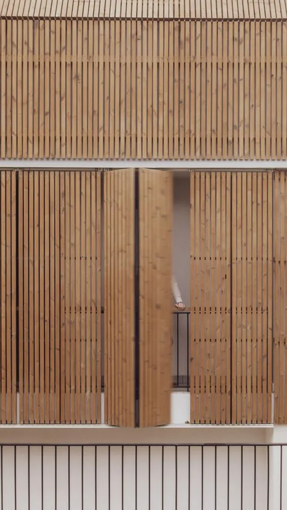 Las fachadas principales, acabadas en mortero blanco mediante un sistema SATE, contrastan sutilmente con la madera de las cubiertas y las contraventanas de las galerías. Esta elección cromática y material otorga al conjunto una identidad propia, fusionando tradición y modernidad. Las contraventanas móviles de madera no solo sirven como elementos de protección solar, sino que también permiten modular la privacidad y la relación visual con el entorno, adaptándose a las necesidades de los habitantes.