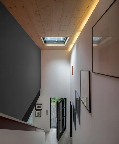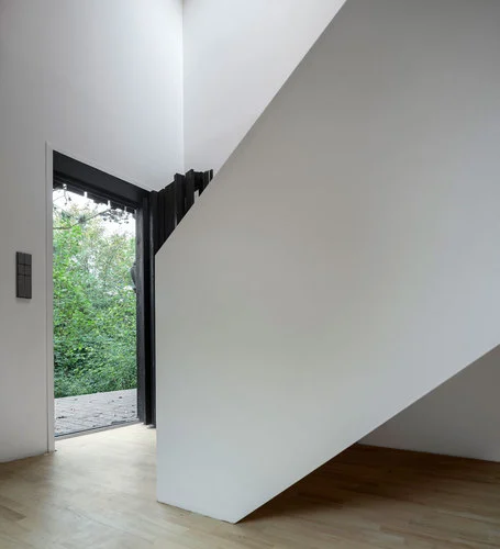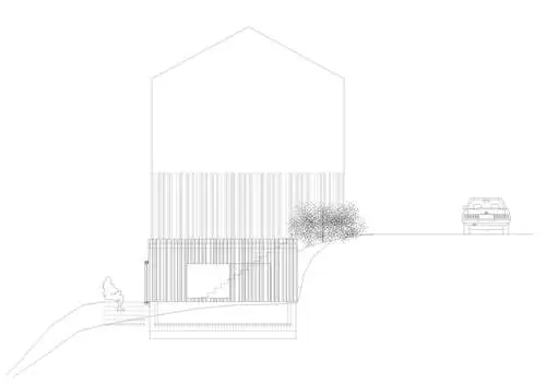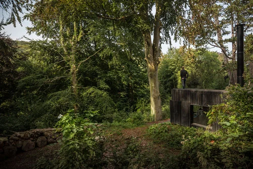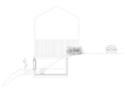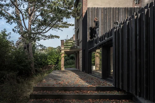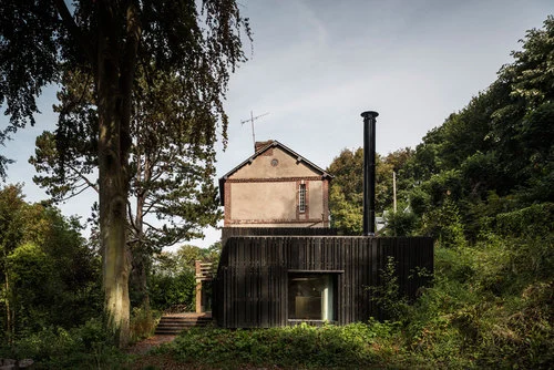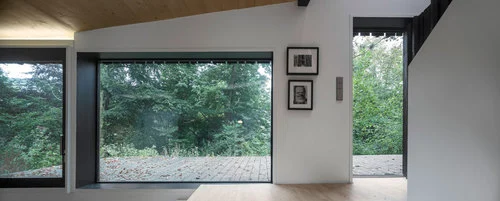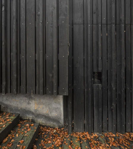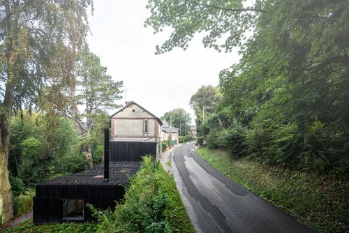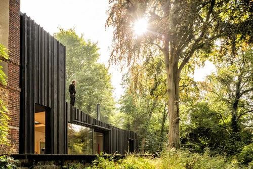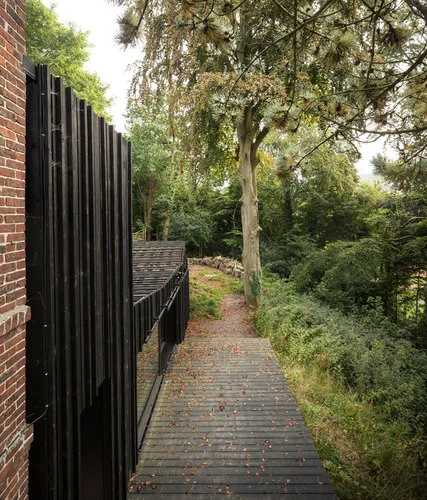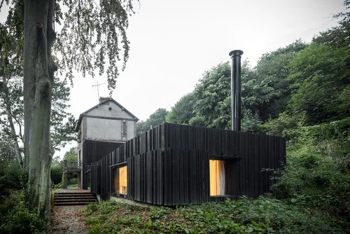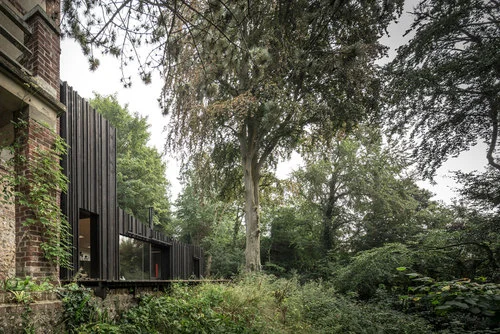 El cliente quería trasladar los espacios comunes a una zona más abierta y transparente, de forma que se pudieran liberar algunas estancias de la antigua edificación. Se levanta un volúmen único donde se ubican la cocina, la sala de estar y el comedor. Desde el interior, las vistas son sobre el jardín y el paisaje. La nueva extensión se conecta a la antigua casa como un volúmen estructural ligero para no sobrecargar los cimientos. Es un proyecto minimal que se integra con el entorno, parcialmente inserto en la topografía, ya que se asienta a un nivel inferior que el terreno. La madera oscura juega con la luz y las sombras, por lo que la extensión desaparece a la sombra del bosque que lo rodea.