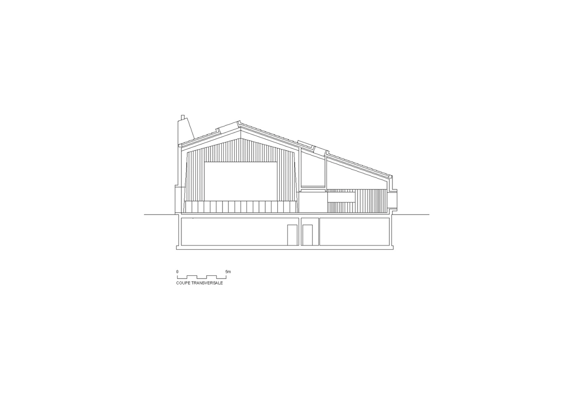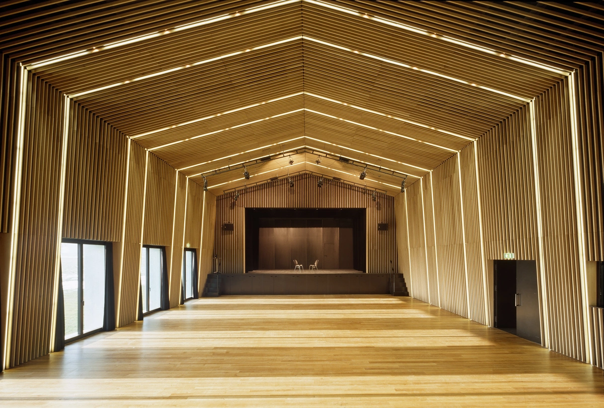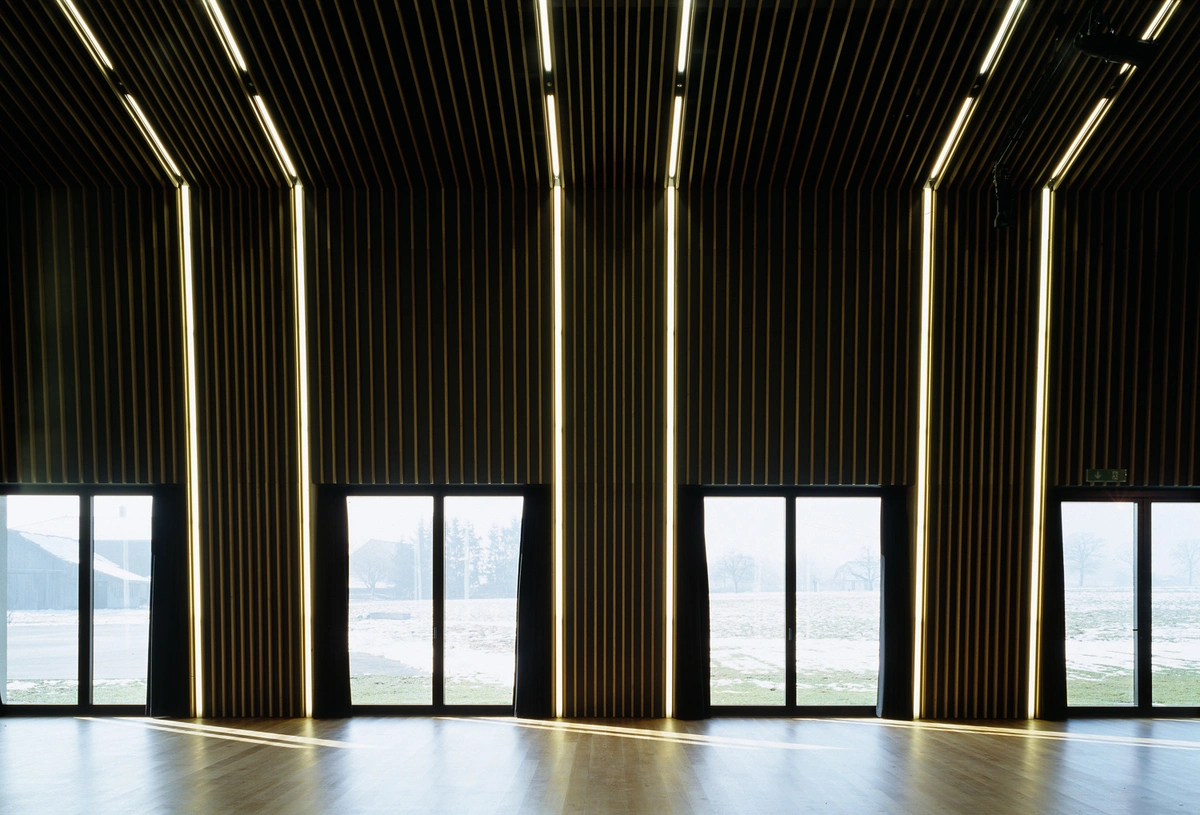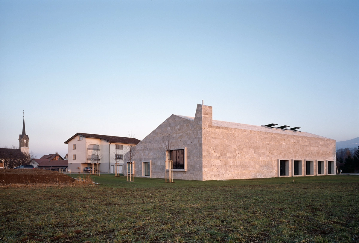 La morfología de la edificación se asienta en granjas y en edificios públicos de los alrededores. Presentando una simplicidad arcaica, el techo se extiende hacia abajo y evoca un arquetipo arquitectónico a través de la reinterpretación de las siluetas conocidas