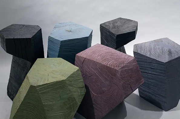 Inspirados por alguna de sus obras anteriores -como los Balancing Blocks, realizados para la marca Areaware-, se lanzaron a modelar allí mismo con toda esa madera un conjunto de taburetes con atrevidos diseños geométricos. Una vez terminados, los trasladaron al estudio, donde los pintaron con diferentes tonos que reproducen los colores de la tormenta, desde el negro más absoluto hasta gamas suaves de azul o verde pastel.