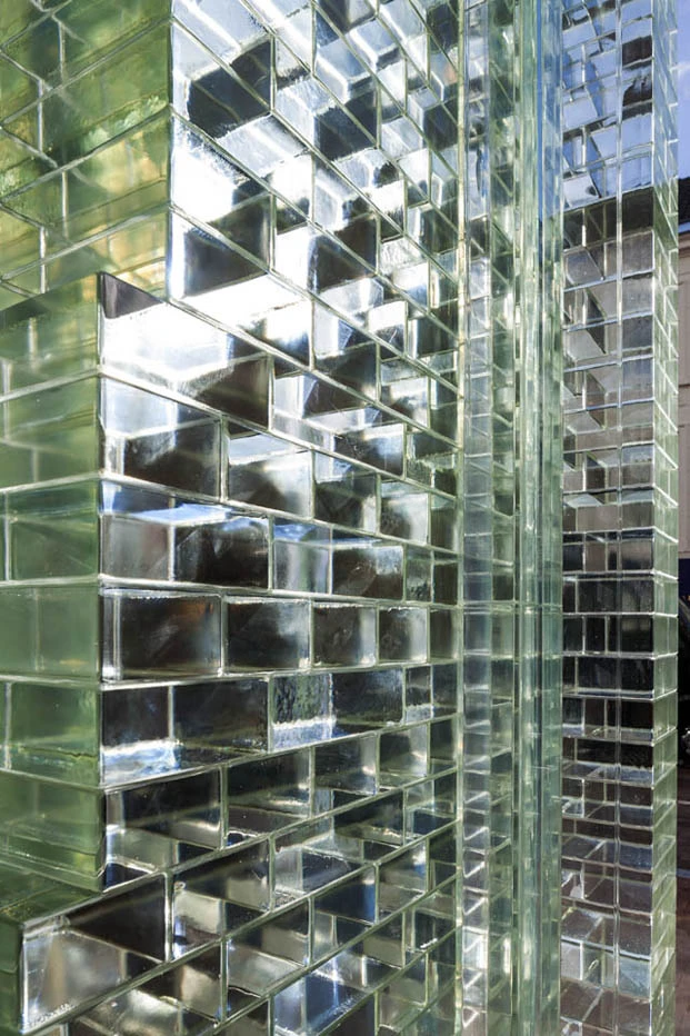 Estos bloques transparentes imitan en tamaño y disposición a los originales y se van mezclando con ellos mientras ascienden por la fachada. La parte superior, dedicada a apartamentos (220 m2), parece así flotar sobre el espacio comercial inferior (620 m2). A pesar de su aspecto delicado, las pruebas de resistencia demostraron que la construcción era más fuerte que el hormigón. Y es que solo el arquitrabe completo de cristal es capaz de soportar una fuerza de hasta 42.000 newtons.
