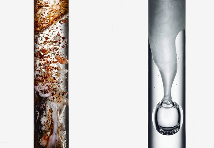 Cuando se observan estas imágenes de Christoffer Dalkarls, la imaginación trabaja a pleno rendimiento y, aun sabiendo ahora el origen natural que hay detrás, es inevitable no quedar maravillado con ellas. Ya fluyan por el interior o amenacen con desbordar el tubo de ensayo, estos líquidos serpenteantes resaltan toda la belleza de la ciencia.