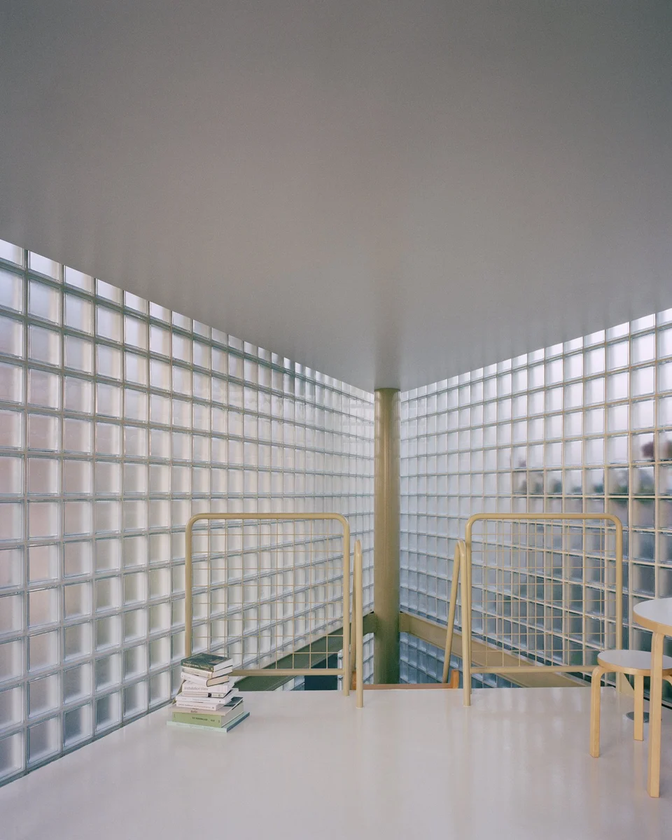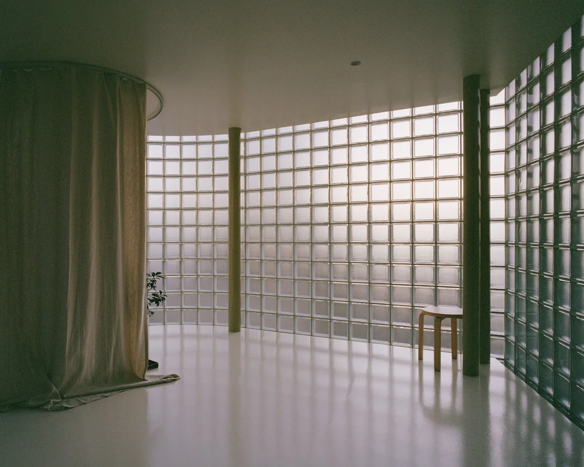 La elección de materiales también juega un rol crucial en este proyecto. Los bloques de vidrio utilizados en la construcción permiten que la luz natural se filtre suavemente en el espacio, creando una atmósfera interior luminosa y acogedora. Este juego de transparencia y solidez no solo aligera visualmente la estructura, sino que también establece un contrapunto sutil pero efectivo con la robusta casa original de hormigón.