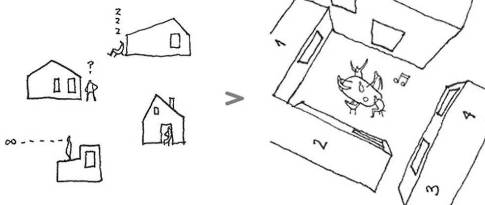 La idea partió de una conversación entre 4 amigos. Todos estaban pensando en comprar o construir una casa de verano pero les daba miedo la idea de estar sentados esperando la visita de los demás. La alternativa fue unir esfuerzos y planear un proyecto común a base de pequeñas unidades para cada familia y una gran zona común. El proyecto se organiza en 4 edificios alrededor de una patio compartido. 3 de las unidades tienen 1 baño y 3 dormitorios, mientras que la casa común cuenta con dos alturas, cocina, biblioteca y sala de estar.