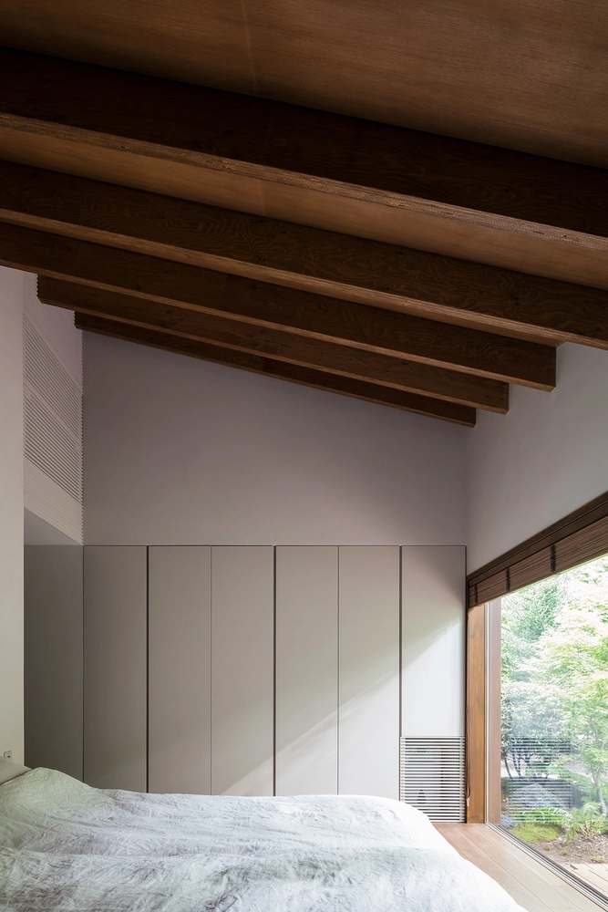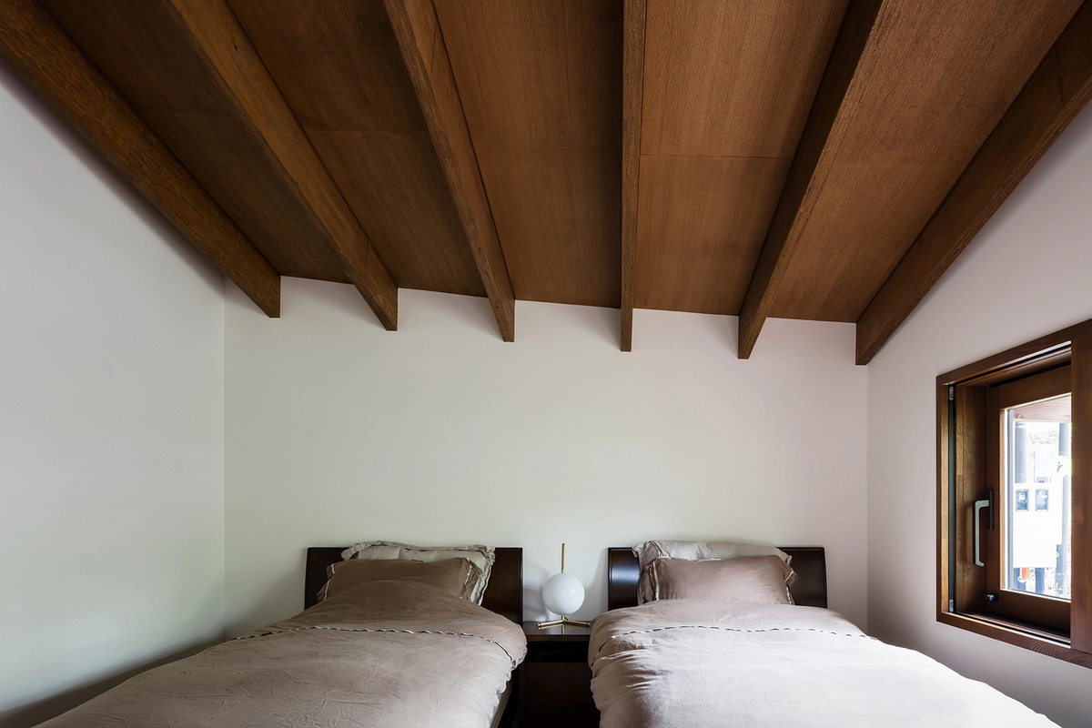 Pero el ingrediente auténticamente rompedor de este proyecto son esos tejados múltiples alabeados, una forma muy enraizada en la cultura asiática. Construidos mediante alineamientos de vigas de madera, una parte de ellas se dejó a la vista como elemento decorativo y dinamizador en las habitaciones.