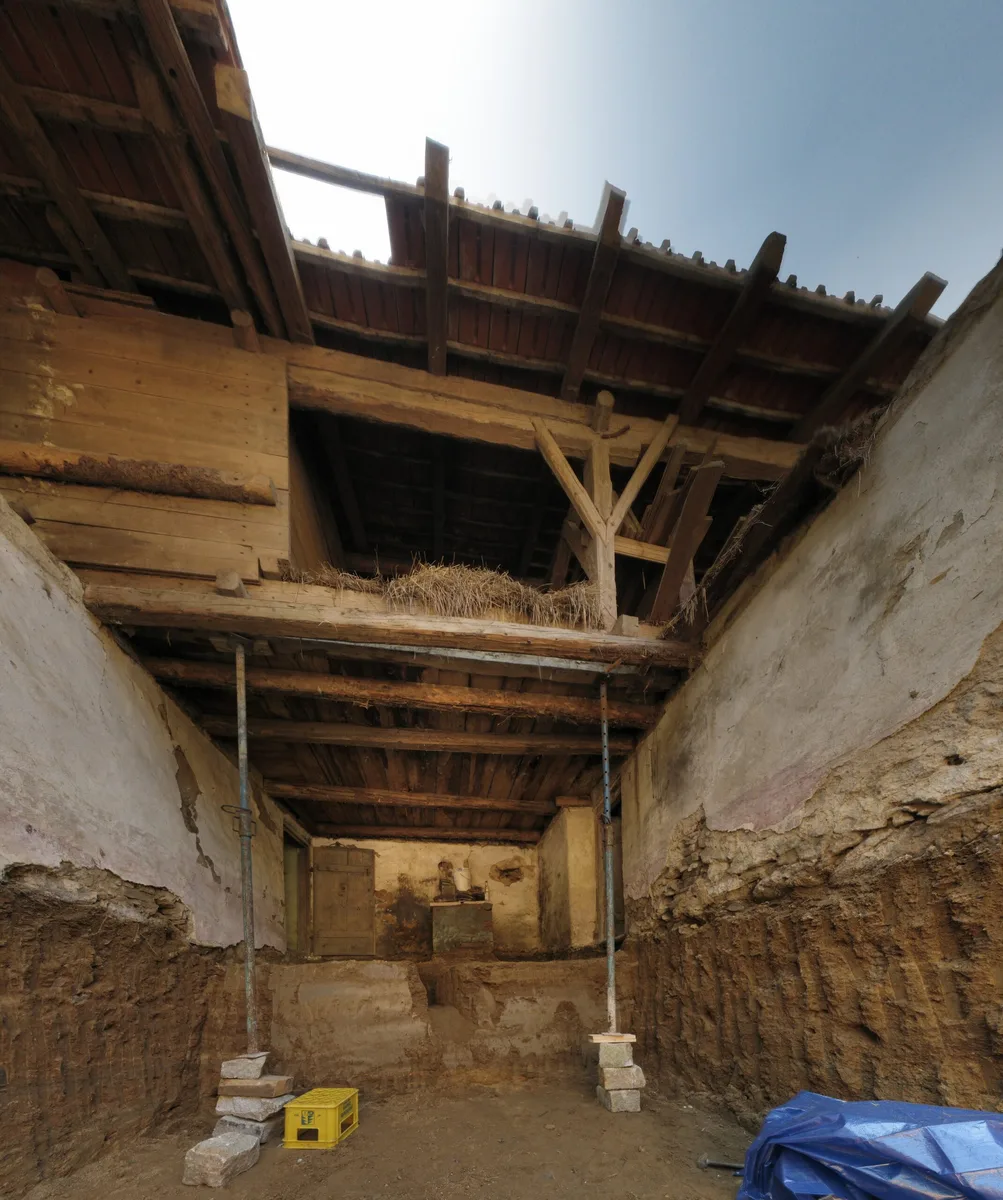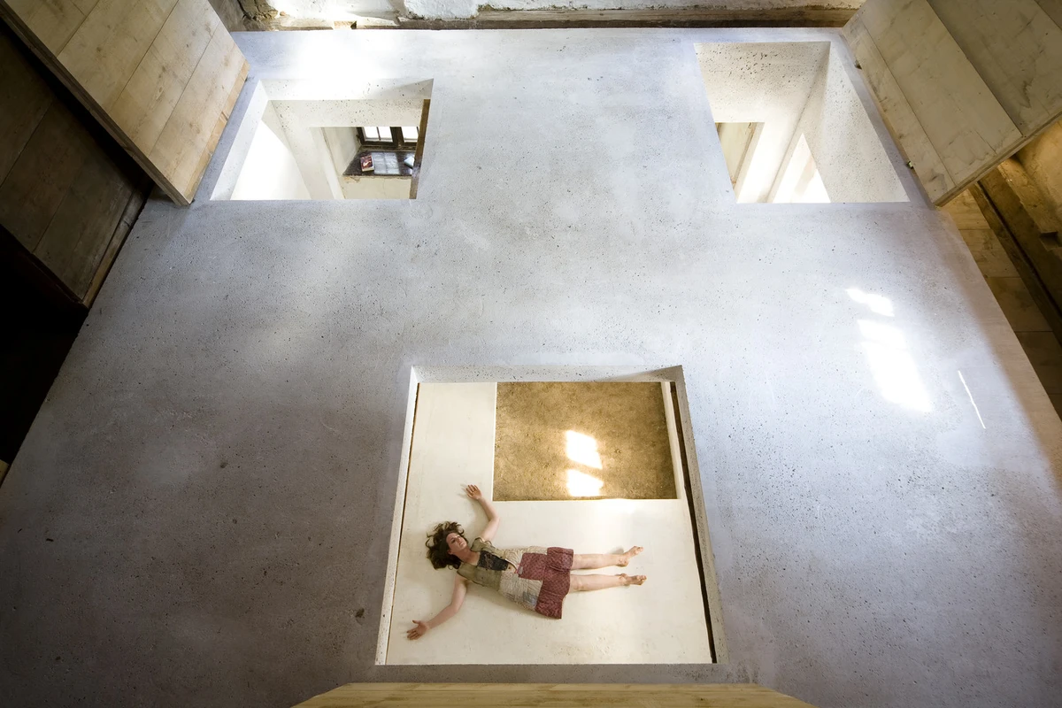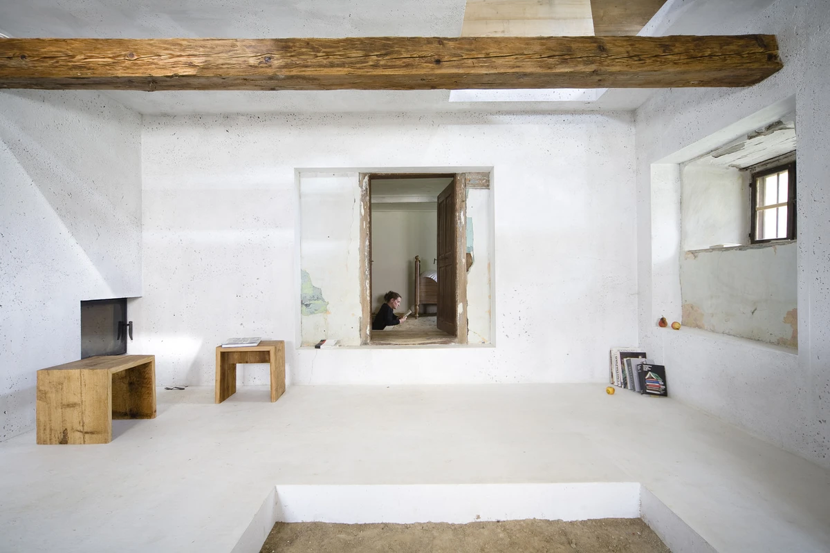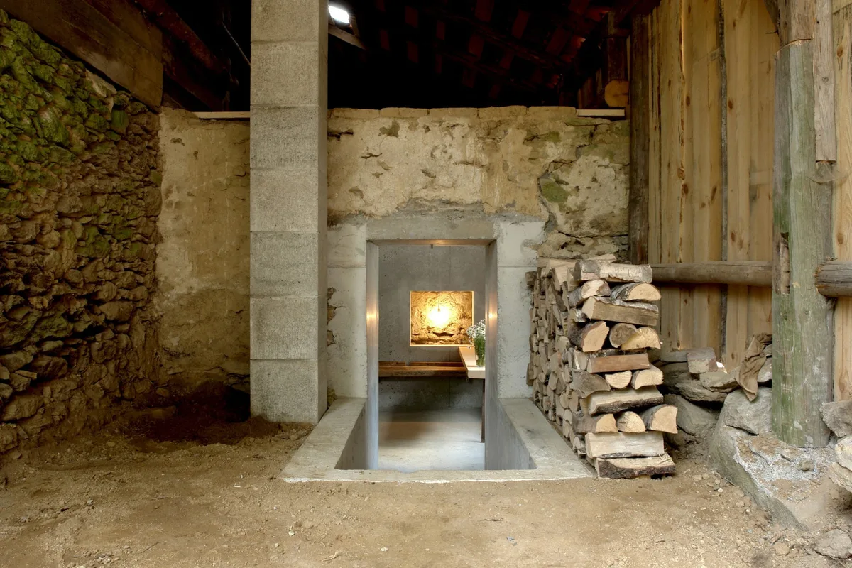 A través de cuatro cubos de hormigón se afianzó la estructura de la vivienda, integrando buena parte de los materiales ya existentes: baldosas, vigas de madera, ventanas y otros accesorios antiguos. Los añadidos modernos no ocultan la esencia original, visible gracias a generosas aberturas, como las practicadas en la nueva buhardilla, que ocupa el espacio del granero. Se ensalza así la modesta vida rural de antaño, reflejada en multitud de detalles, desde los bancos corridos hasta el suelo de tierra de la sala de estar.