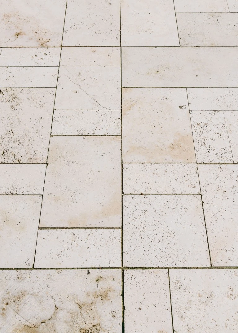 El material cubre los tres niveles de las terrazas con piezas recuperadas de otro proyecto realizado en tierras de Gerona. Dicho origen implicaba el uso de piezas no muy grandes de diferentes tamaños, lo que conllevó un esfuerzo extra de ajuste entre ellas para lograr una trama atractiva. Su disposición final es una compleja mezcla de rectángulos, que aun siguiendo un patrón a lo largo del todo el patio, no es fácil de detectar a simple vista.