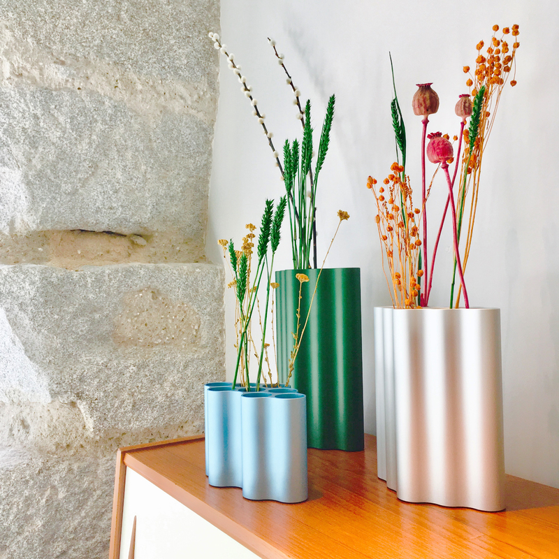 Teniendo en cuenta esta falta de espacio, tal vez no haya mucho hueco libre para colocar maceteros con plantas que adornen la estancia. ¡No te preocupes! Existen otras opciones como los jarrónes Nuage compuesto por tubos de aluminio y disponibles en tamaños y varios colores, como el verde, que dará un aspecto más natural o en plateado si buscas dar un toque más industrial. Además, puedes combinar varios en distintos colores ya que los tubos de aluminio encajan a la perfección entre sí.