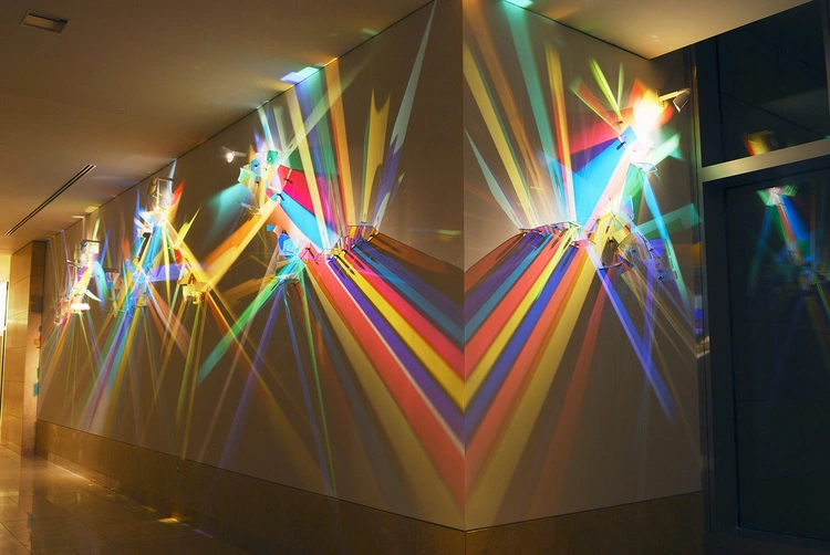 Estos intrincados rayos se concentran, chocan, giran o se desvanecen a lo largo de todo el espacio, mezclándose con una potencia impresionante en una especie de explosión inocua de tonalidades. El resultado es un híbrido inmaterial entre pintura y escultura con matices arquitectónicos.