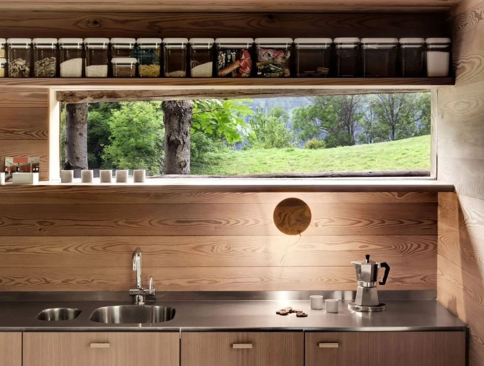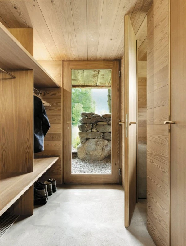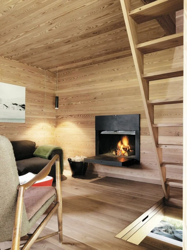 El interior se ha realizado casi en su totalidad con paneles contrachapados de roble, de enorme calidez. El reducido volumen interior, la inteligente distribución de los espacios y la chimenea de leña, con hogar abierto, aseguran que la casa se mantenga caliente con facilidad durante los meses de invierno.