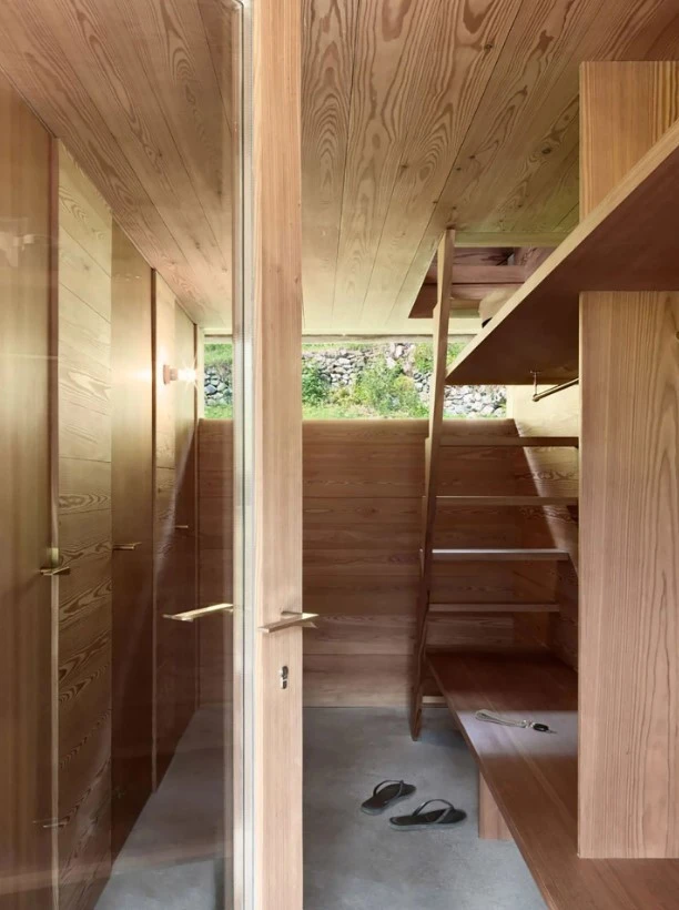 Bajo la zona de estar existe un nivel más, excavado en el terreno y con un cerramiento exterior en piedra que sirve de soporte a la cabaña. En él se ubican el baño, zonas de almacenaje y otros accesos.
