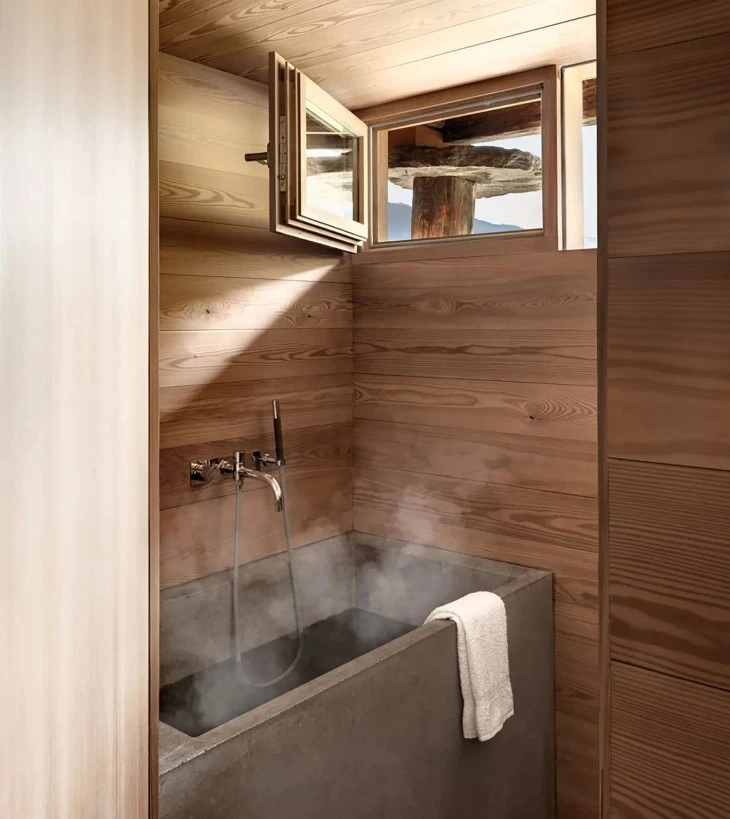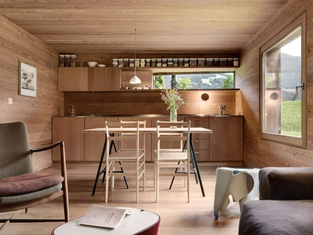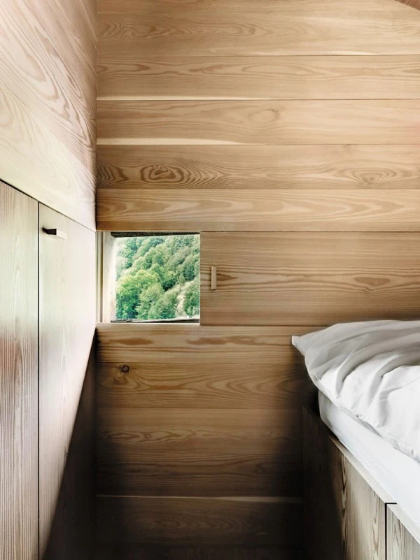 En un marcado y deliberado contraste con esa imagen exterior, inaccesible y dura, el interior se revela como un espacio luminoso, cálido y enormemente acogedor, diseñado en cada detalle: un ejercicio de diseño que permite disfrutar de las estaciones cambiantes en este rincón de los Alpes suizos.