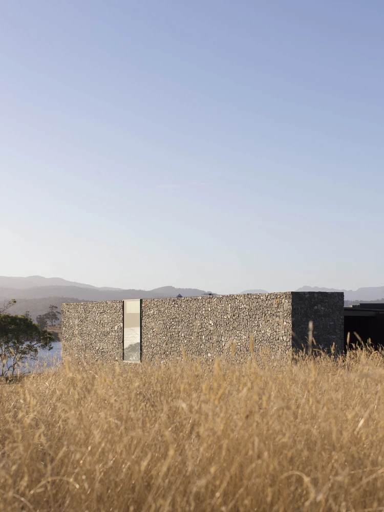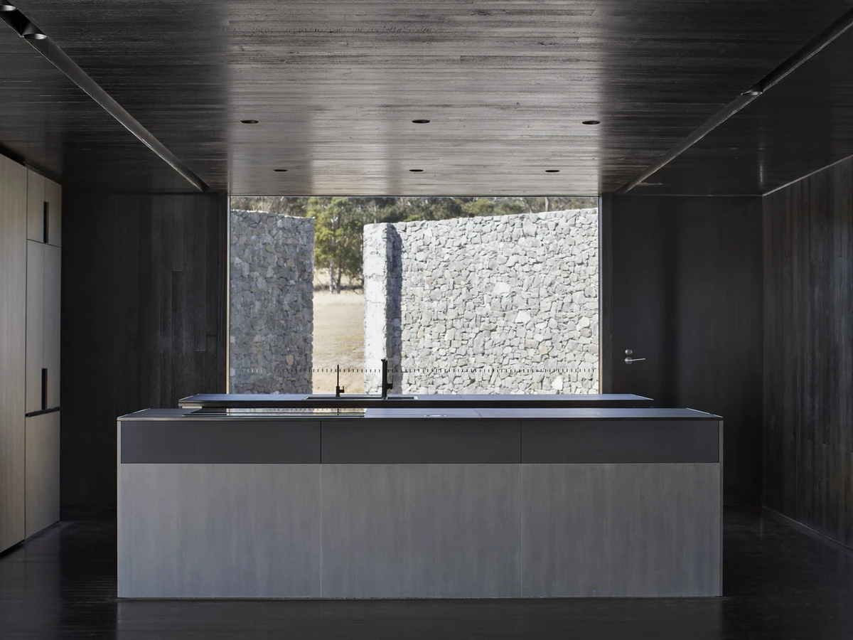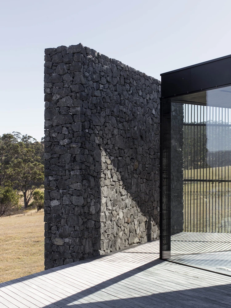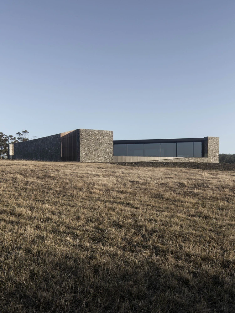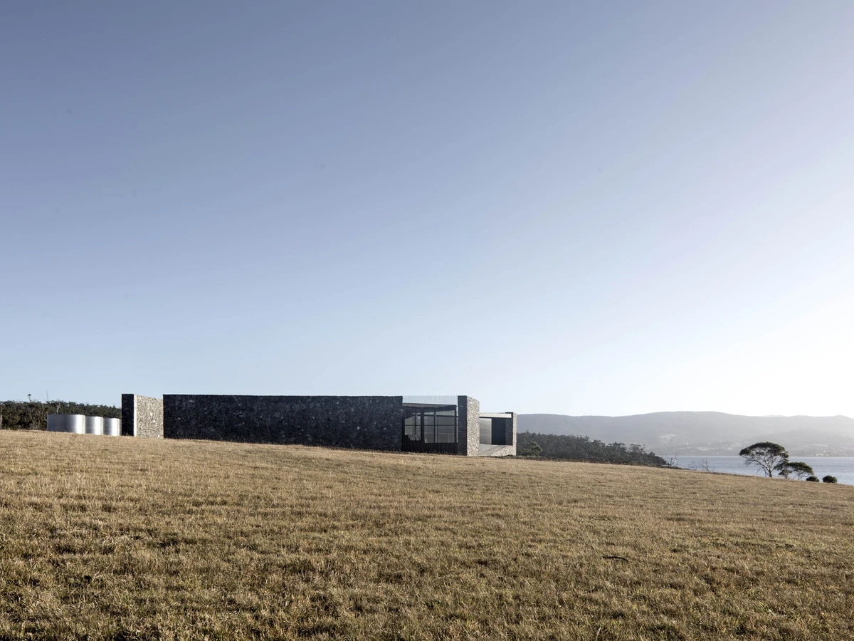 La solución se basa en una planta no ortogonal con inflexiones. Para proteger la vivienda de los embates del aire, se dispuso una gruesa piel exterior en forma de altos muros de piedra. Y en un guiño a la profesión de los futuros habitantes, se eligió como material de construcción la dolerita, una roca con una antigüedad en Tasmania de 180 millones de años.