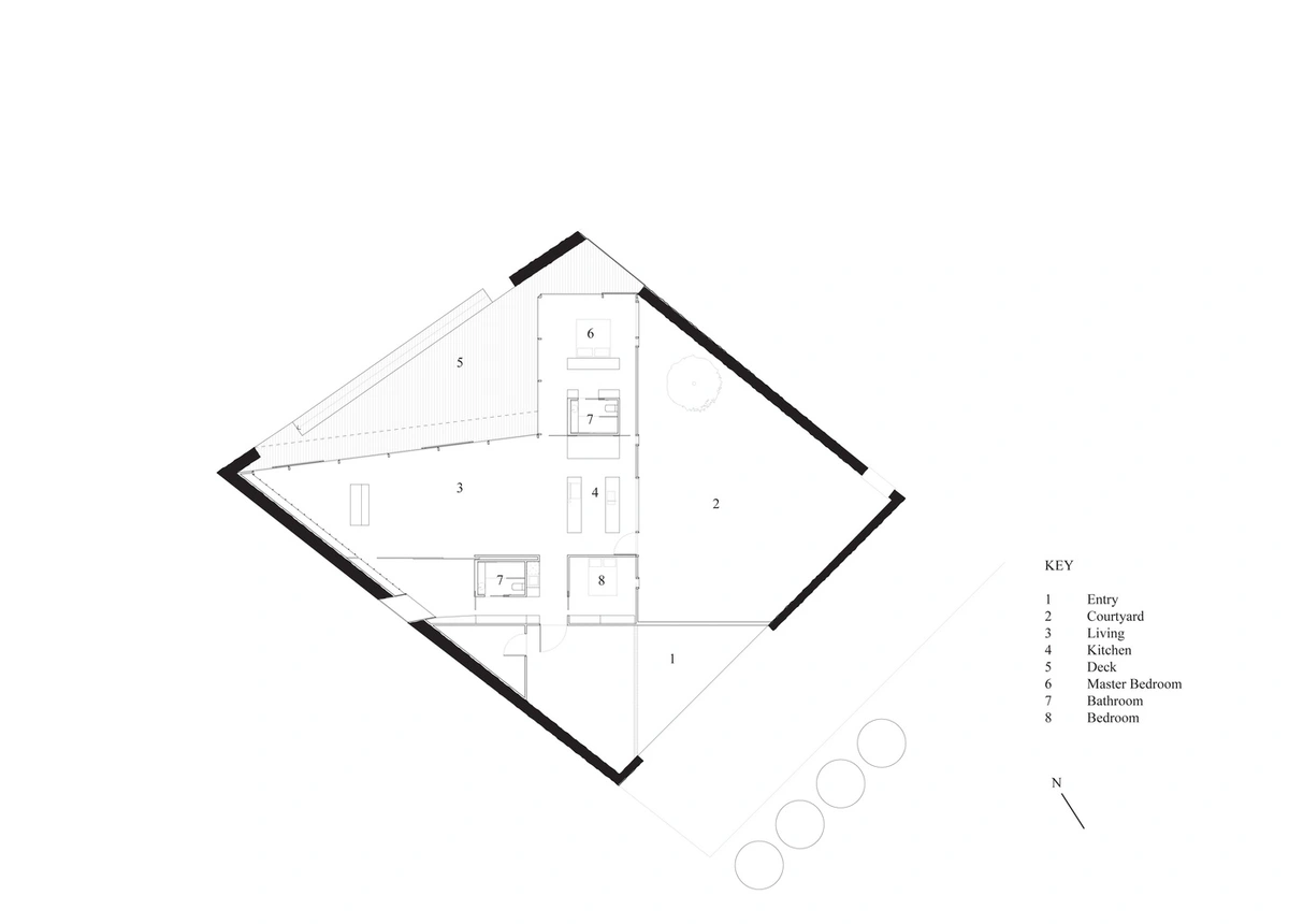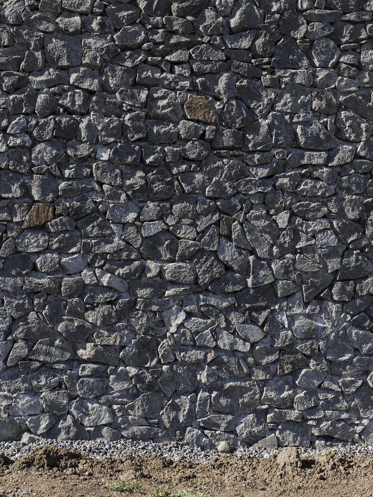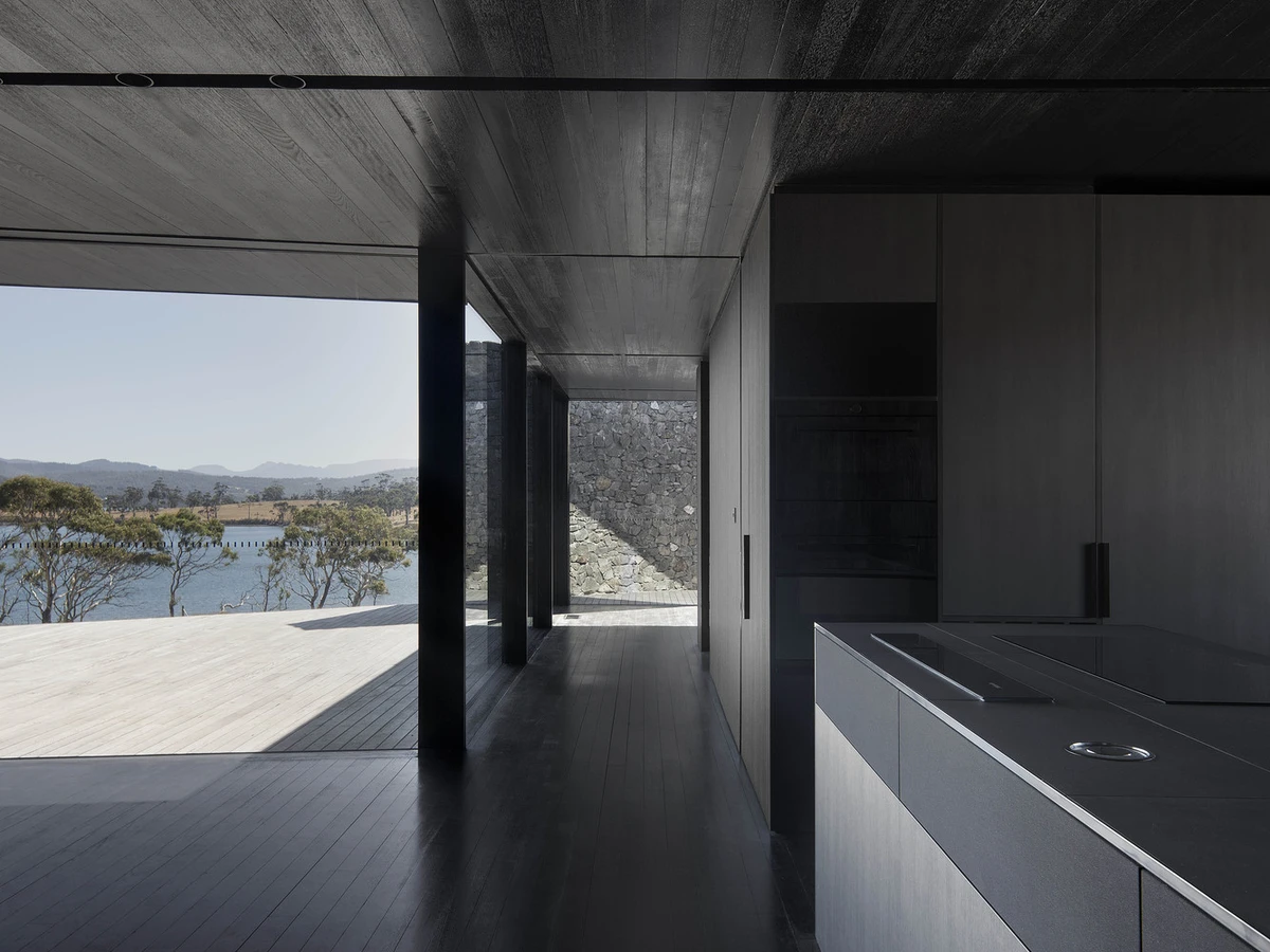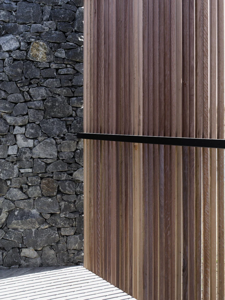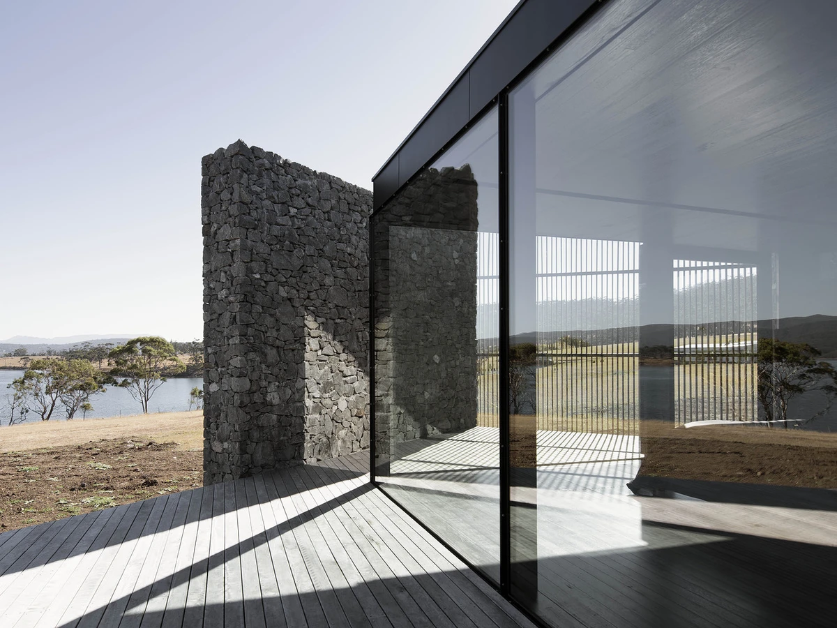 La solución se basa en una planta no ortogonal con inflexiones. Para proteger la vivienda de los embates del aire, se dispuso una gruesa piel exterior en forma de altos muros de piedra. Y en un guiño a la profesión de los futuros habitantes, se eligió como material de construcción la dolerita, una roca con una antigüedad en Tasmania de 180 millones de años.
