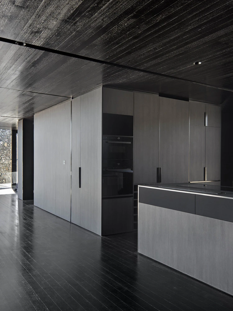Ese aspecto monumental de fortaleza se equilibró mediante unos interiores en madera con el color negro como protagonista. Dicha tonalidad proporciona un agradable alivio ante la deslumbrante luz que inunda la isla, a la vez que enmarca el paisaje exterior en todo su esplendor.