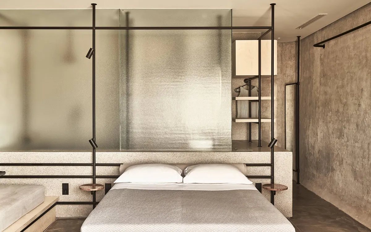 Al hotel se accede por detrás de los depósitos, a través de un airoso pabellón-bar con voladizos donde las paredes de cristal no ocultan la playa ni el mar. Una vez en la habitación de 30 m2, el frescor interior libera al cliente del calor. Decoradas en colores terrosos, el huésped puede abrir de par en par los grandes ventanales correderos para que entre la brisa nocturna, o bien disfrutar del panorama diurno desde su terraza privada protegida con toldos.